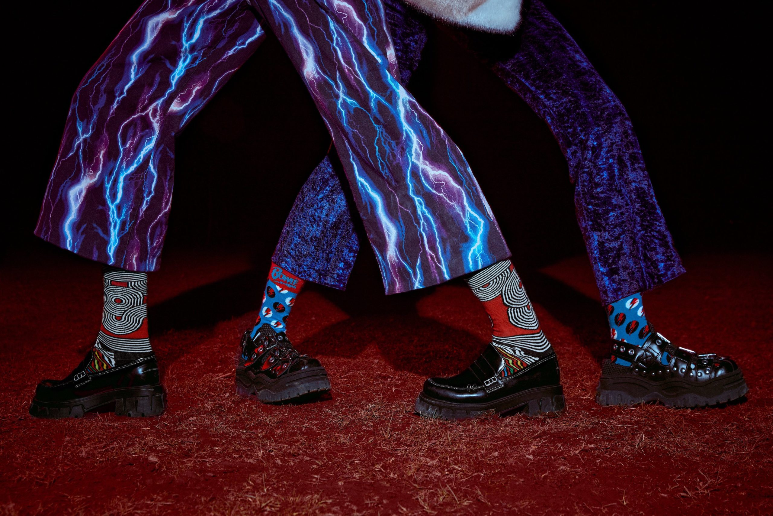 Teil der Kollektion sind so die beiden Styles „The Silver Lining“ und „The Ziggy Special“, die entscheidende Momente von Bowies Karriere zelebrieren. Während „The Silver Lining“ den silberfarbenen Zebra-Look, den Bowie als Kunstfigur „The Thin White Duke“ mehrfach trug, aufgreift und als mattschwarzen Socken-Stil mit schimmernden Silberdetails umsetzt, greift „The Ziggy Special“ die exzentrischen Elemente von Ziggy Stardust auf. Im Mittelpunkt steht der asymmetrische Einteiler, der bis heute als ikonisches Bühnenoutfit gilt und im Rahmen der Kollektion mit Socken, die mit funkelnden Fersen und Spitzen versehen sind, widergespiegelt wird. Das Besondere: Getreu dem Original wird dieser Stil mit einer Socke sowie zwei Knöchelreifen geliefert, damit dem ganz eigenen Bowie-Moment nichts mehr im Wege steht.