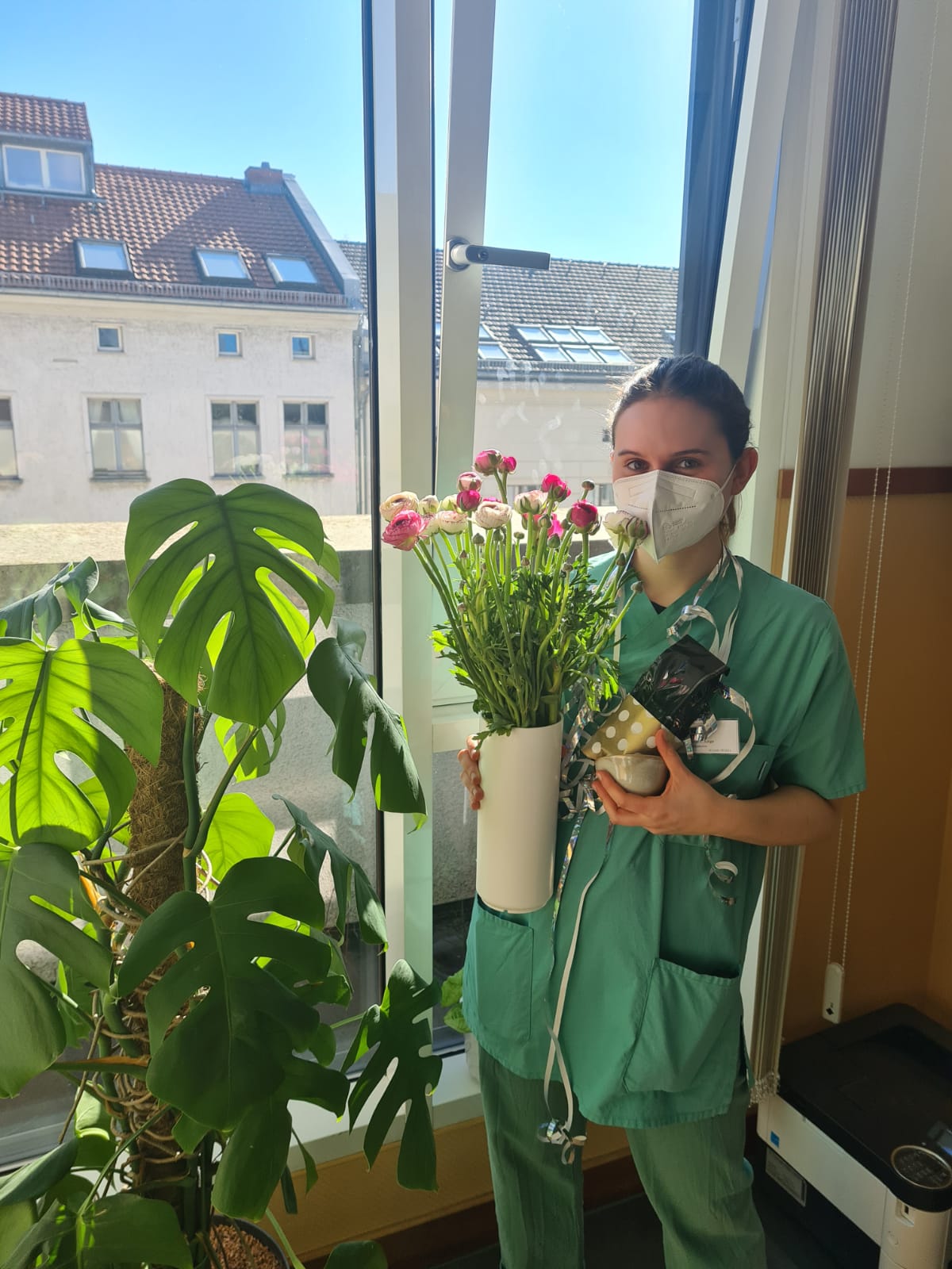 Heute ist Nachtdienst angesagt. Deshalb kann ich heute ausschlafen, um 9:00 Uhr noch im Bett liegen und lesen, so schön. Dann noch mit meinem Mann Kaffee trinken, ein bisschen an meinem wissenschaftlichen Artikel schreiben und Essen für das Wochenende bestellen. Ich liebe es, mir Vorfreude zu machen: 77,00 Euro für koreanisch-spanische Fusionsküche. Um 11:30 Uhr schwinge ich mich aufs Rad, fange unterwegs einige Sonnenstrahlen und kaufe noch schnell für 2,00 Euro einen Blumenstrauß zum Abschied einer Kollegin.