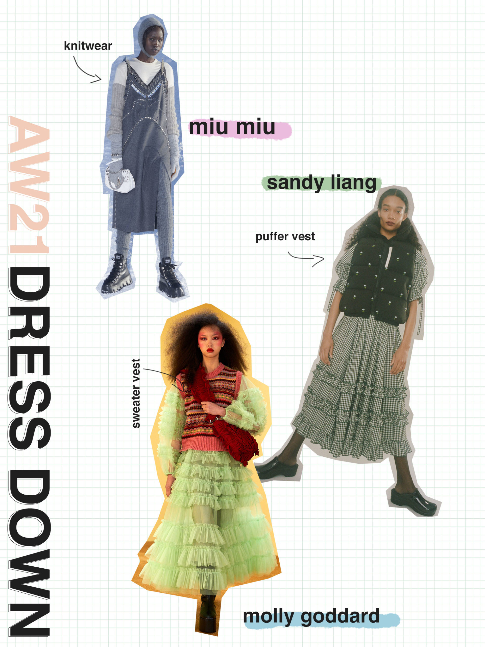 Wie man Tüll, Rüschen und Kleider mit funkelnden Stickereien ein wenig lässiger tragen kann, zeigten sowohl Miu Miu als auch Sandy Liang und Molly Goddard. Während man das verspielte Sommerkleid in New York (Sandy Liang) kurzum zur Puffer-Weste kombiniert, folgt in London (Molly Goddard) der Pullunder aufs opulente, semi-transparente Rüschenkleid. In Paris (Miu Miu) trägt man Strick und möglichst dicke Wollstrumpfhosen zum Slip Dress mitsamt Glitzersteinen. Bei allen drei Varianten gilt: Layering is Key. An den Füßen ging es ebenfalls weniger zart zu, statt Pumps und Sandaletten stehen hier Clogs (ohnehin, der Schuh der Stunde), Wanderstiefel und Lederboots mit dicker Plateau-Sohle im Vordergrund.