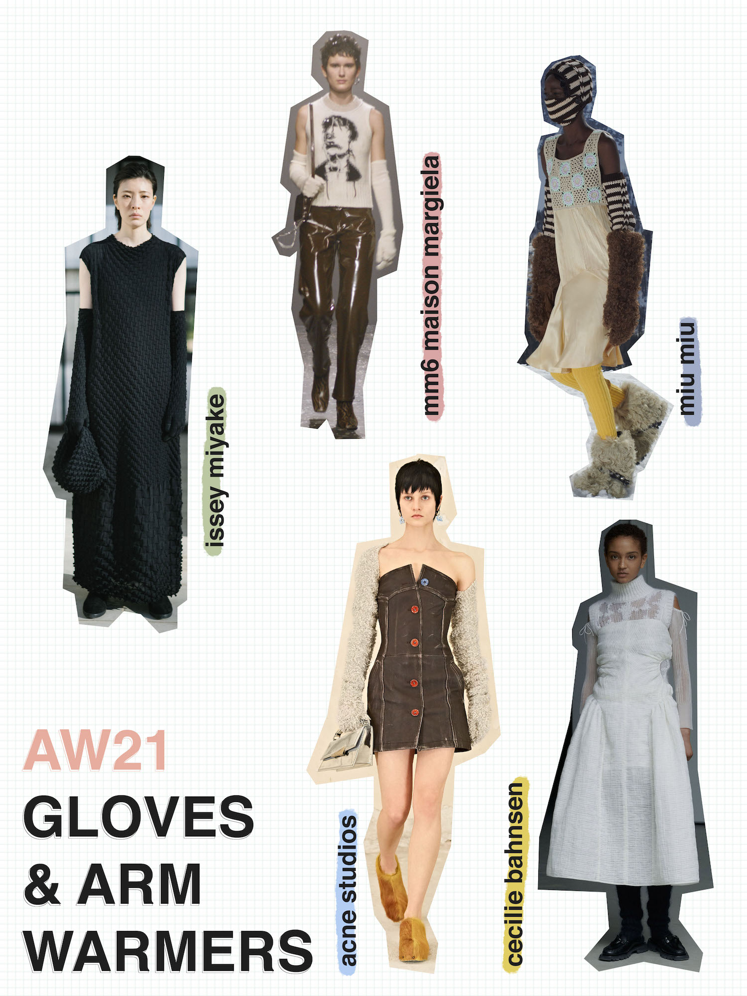 Eine Vielfalt an Handschuhen, die teils bis zum Oberarm reichen, gab es bei Issey Miyake, Miu Miu, Sunnei, Givenchy, Courrèges, Acne Studios und MM6 Maison Margiela zu bestaunen. So unterschiedlich sie auch sein mögen, so hatten sie doch eines gemeinsam: Stylist*innen kombinierten sie stets zu ärmellosen Kleidern und Tops. Meine heimlichen Favoriten stammen von Courrèges und MM6 Maison Margiela, wohl, weil sie den Geist der 90er-Jahre in sich tragen.