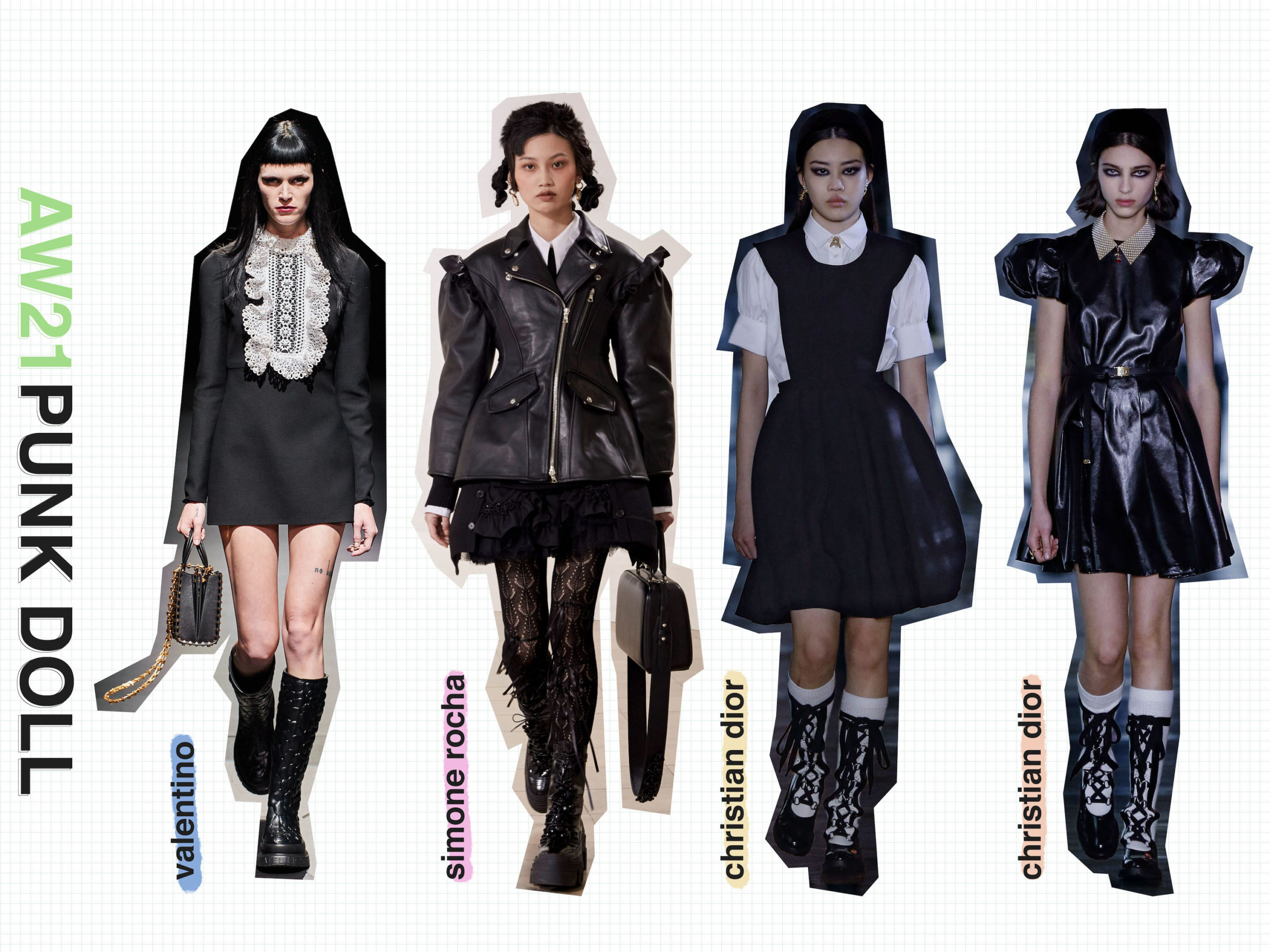 Eine ähnliche Ästhetik sah man in Teilen auch bei Christian Dior: die ersten Looks beinhalteten kleine Puffärmel, Leder, kniehohe Socken und schwarz umrandete Augen. An den Füßen trug man Mary Janes, deren Schnürbänder sich um Wade und Schienbein wickelten und so einen hübschen Kontrast zu den weißen Strümpfen bildeten. Im Modehaus Valentino trafen hingegen klobige Schnürboots auf Haare, die an Wednesday Adams erinnerten, sowie kurze Minikleider samt weißer Spitze.