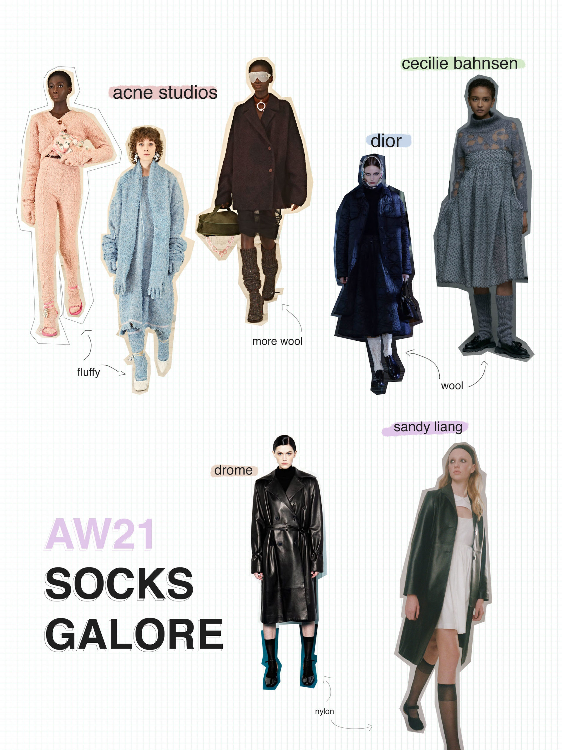 Socken und Strümpfe aus Nylon oder Wolle gab es bereits in vergangenen Saisons auf den Laufstegen zu sehen — etwa in den Prada SS19 und FW20 Kollektionen oder vergangenes Jahr bei Sies Marjan — in diesem Februar und März jedoch zeigten sie sich so häufig wie wohl schon lange nicht mehr. Während Acne Studios auf fluffige Exemplare im „Kuschelsocken“-Stil setzte, widmeten sich Drome und Sandy Liang dünneren Kniestrümpfen aus Nylon. Dicke Wollsocken, die fast bis zum Knie reichen, trug man außerdem bei Cecilie Bahnsen, Dior und ebenfalls Acne Studios — natürlich stets zu Kleid und Rock in Midi-Länge. Mein Favorit: Die Modelle von Acne Studios, ganz ähnliche Exemplare schützen mich nämlich bereits seit einigen Monaten vorm kalten Holzboden meiner Wohnung.