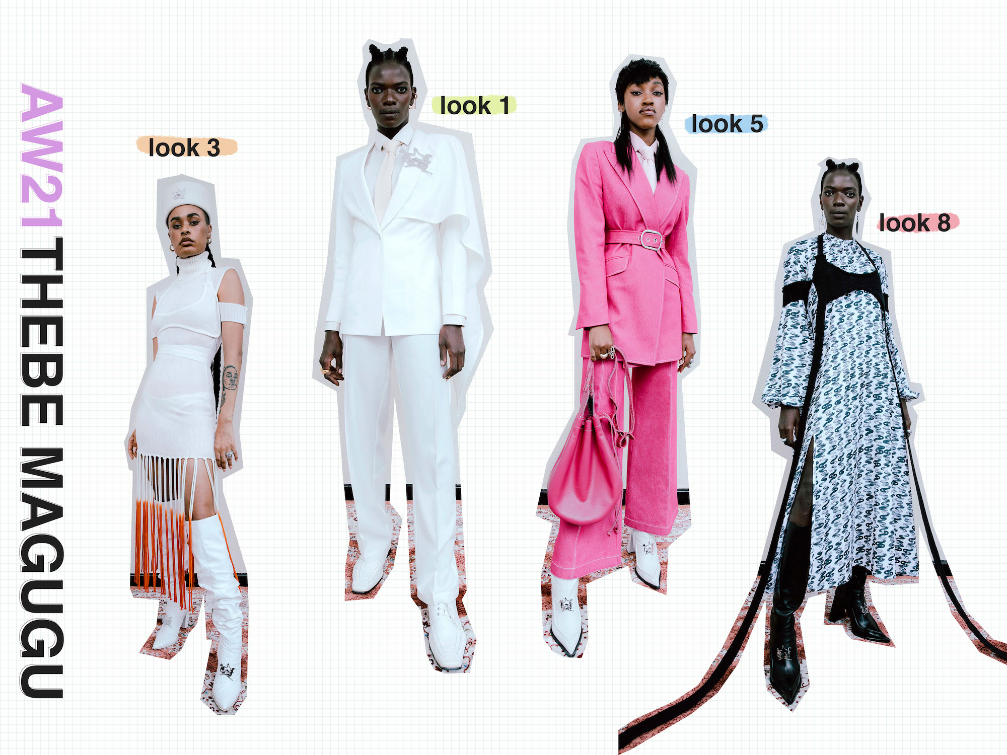 Zum ersten Mal stieß ich während meines Praktikums bei L’Officiel auf Thebe Magugu. Damals schrieb ich ein Designer-Portrait zu einem wunderbaren Editorial, das ich heute noch immer vor Augen habe. Seither hat sich der Designer ganz schön weiterentwickelt und zeigt seine Kollektionen mittlerweile in Paris. Seine AW-21 Kollektion findet ihren Anfang in der afrikanischen Spiritualität, vereint dabei Altes mit Neuem. Inmitten von Kleidern im Ombré-Stil und weiten Capes findet man etwa ein eng geschnittenes Mini-Kleid mit Fransen und einen pinkfarbenen Anzug mitsamt weißen Stiefeln. Es ist das erste pinkfarbene Kleidungsstück, das ich tatsächlich gerne tragen würde, auch wenn ich mir jahrelang einredete, niemals auf Pink zurückzugreifen — passenderweise sagte Thebe Magugu in einem Interview anlässlich seiner Kollektion: „I think we’ve all seen something that we’ve hated at first, then down the line, we become convinced. Never say never in fashion, because you don’t know when things will be decontextualized and become exciting“. Wie wahr.