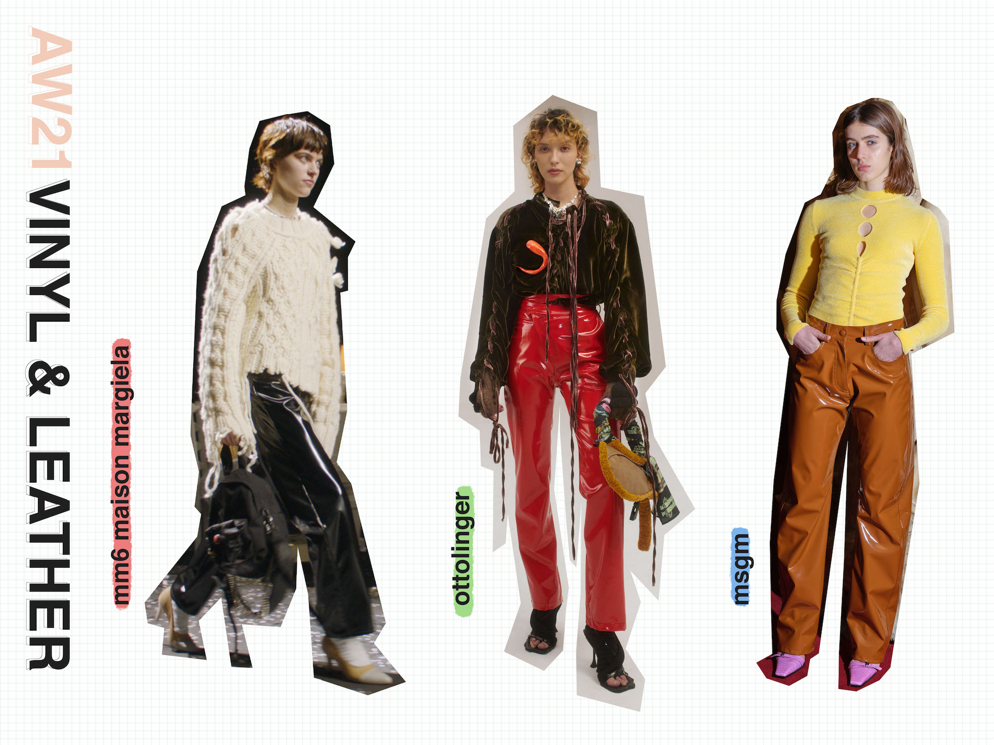 Gerade glaubte ich, Vinyl sei nach seinem Höhenflug im Jahr 2017 wieder ein wenig von der Bildfläche verschwunden, schon sah man die vielleicht schönsten Exemplare Ende Februar und Anfang März in Mailand: Während MM6 Maison Margiela ein schwarzes Modell mit weit geschnittenem Bein zu Pumps, Socken und Strickpullover präsentierte, zeigten sich die Kreationen von MSGM in unterschiedlichen Farben. Angelehnt an das Mailänder Underground-Nachtleben kreierte Massimo Giorgetti so diverse Looks, die zuweilen fast gänzlich aus braunem, schwarzem und lilafarbenem (wie Giorgetti sagte: nachhaltig produziertem) Vinyl und Latex bestanden.