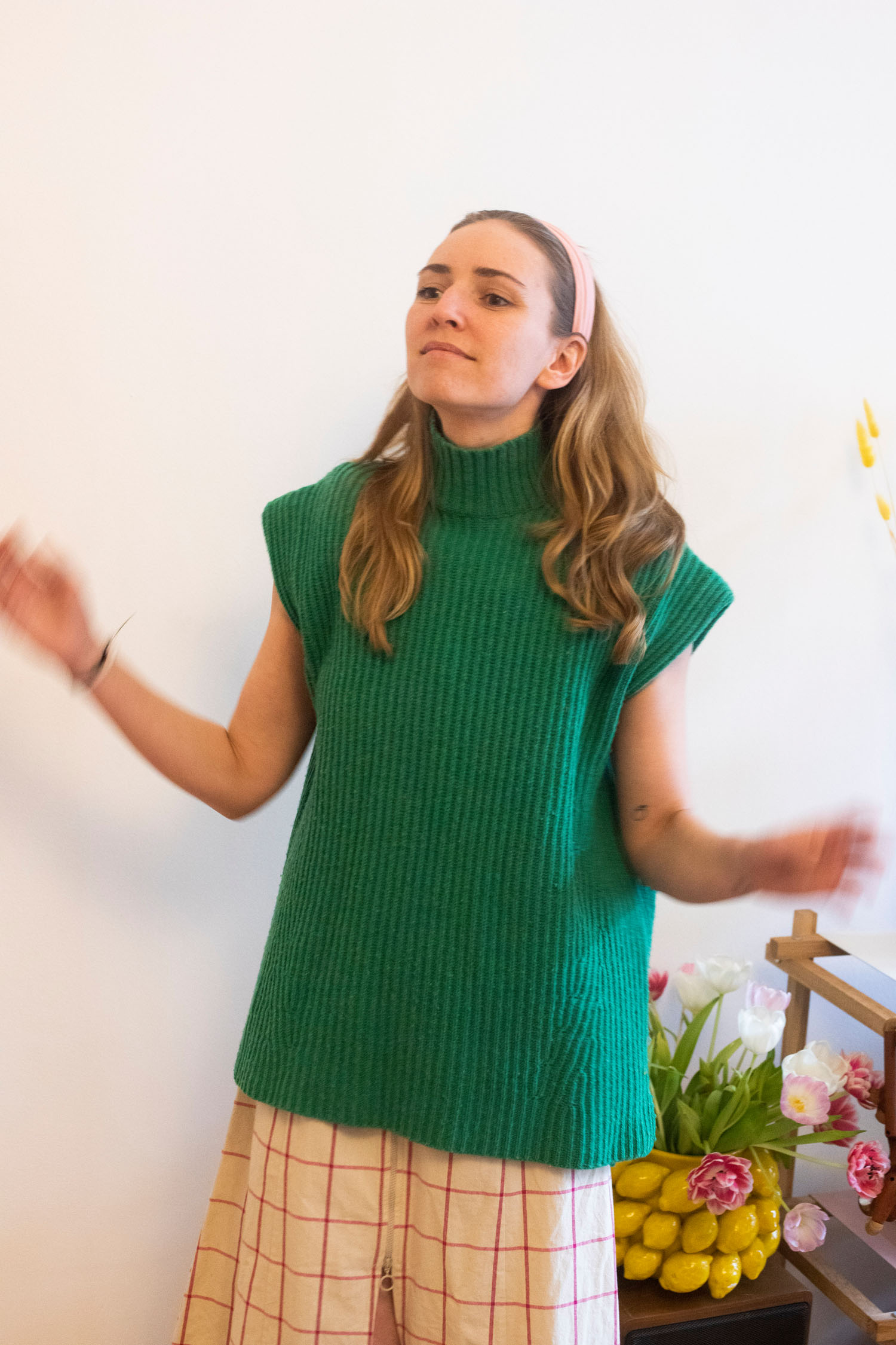 Pullunder: Ganni (in blau hier), Kleid: Baum & Pferdgarten, & Other Stories: Haarreif