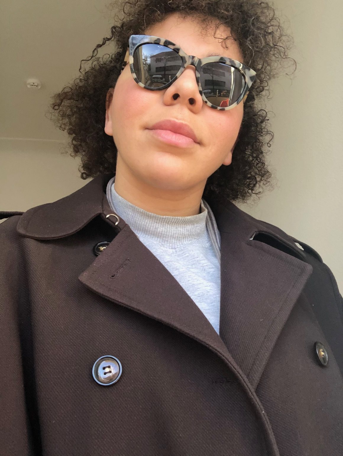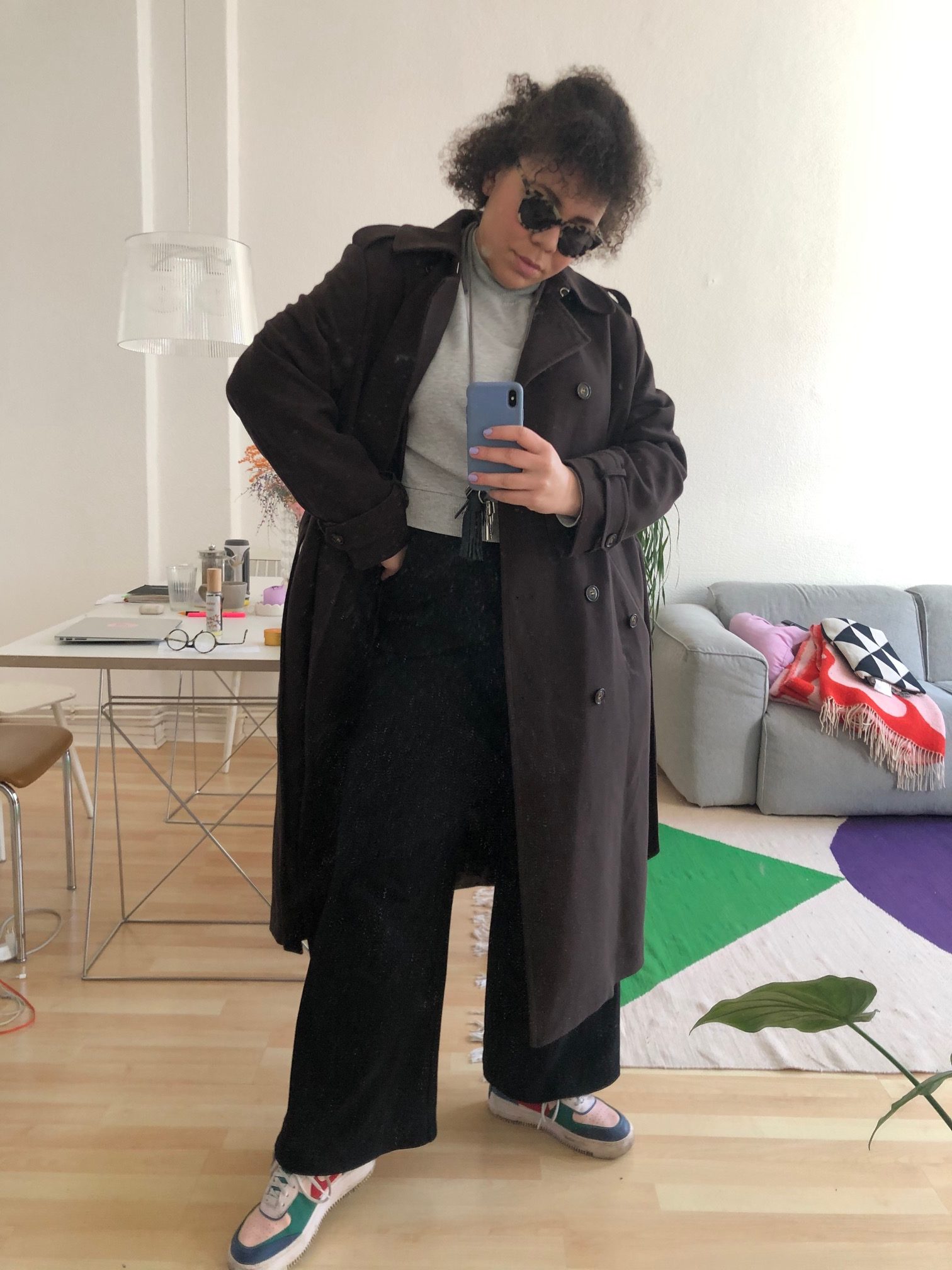 Mantel: H&M Trend (via Vinted, ähnlich hier), Sweatshirt: H&M Trend (via Vinted, ähnlich hier), Brille: H&M Trend (via Vinted, ähnlich hier), Sneaker: Nike Air Force (älter, ähnlich hier)