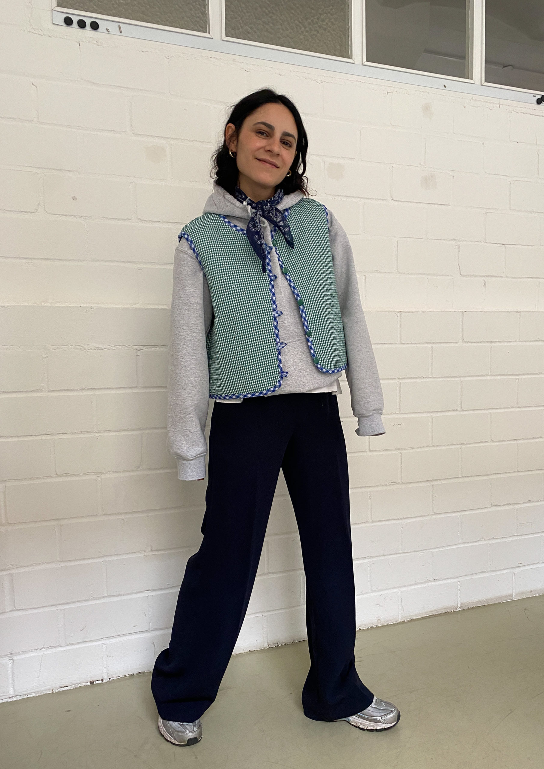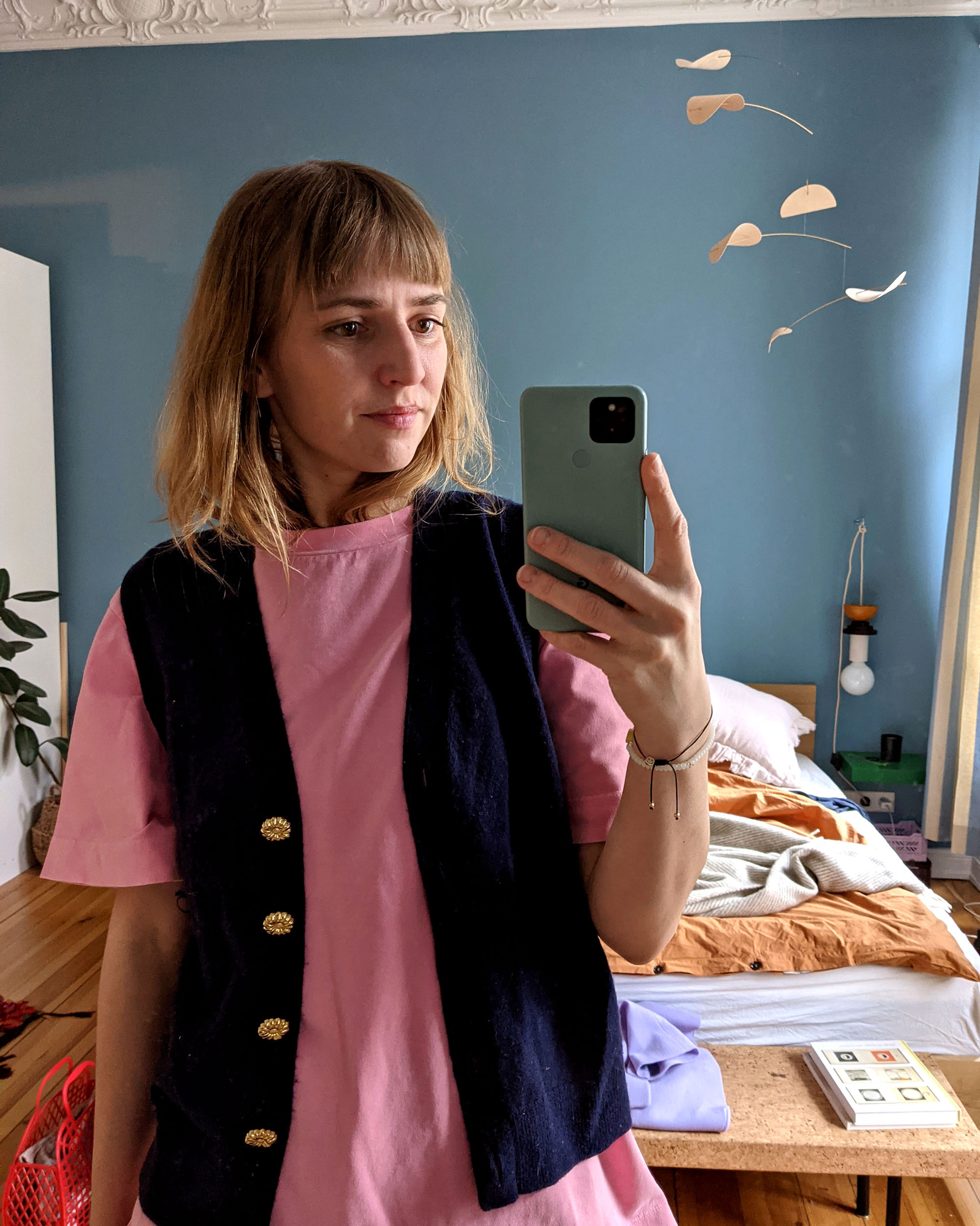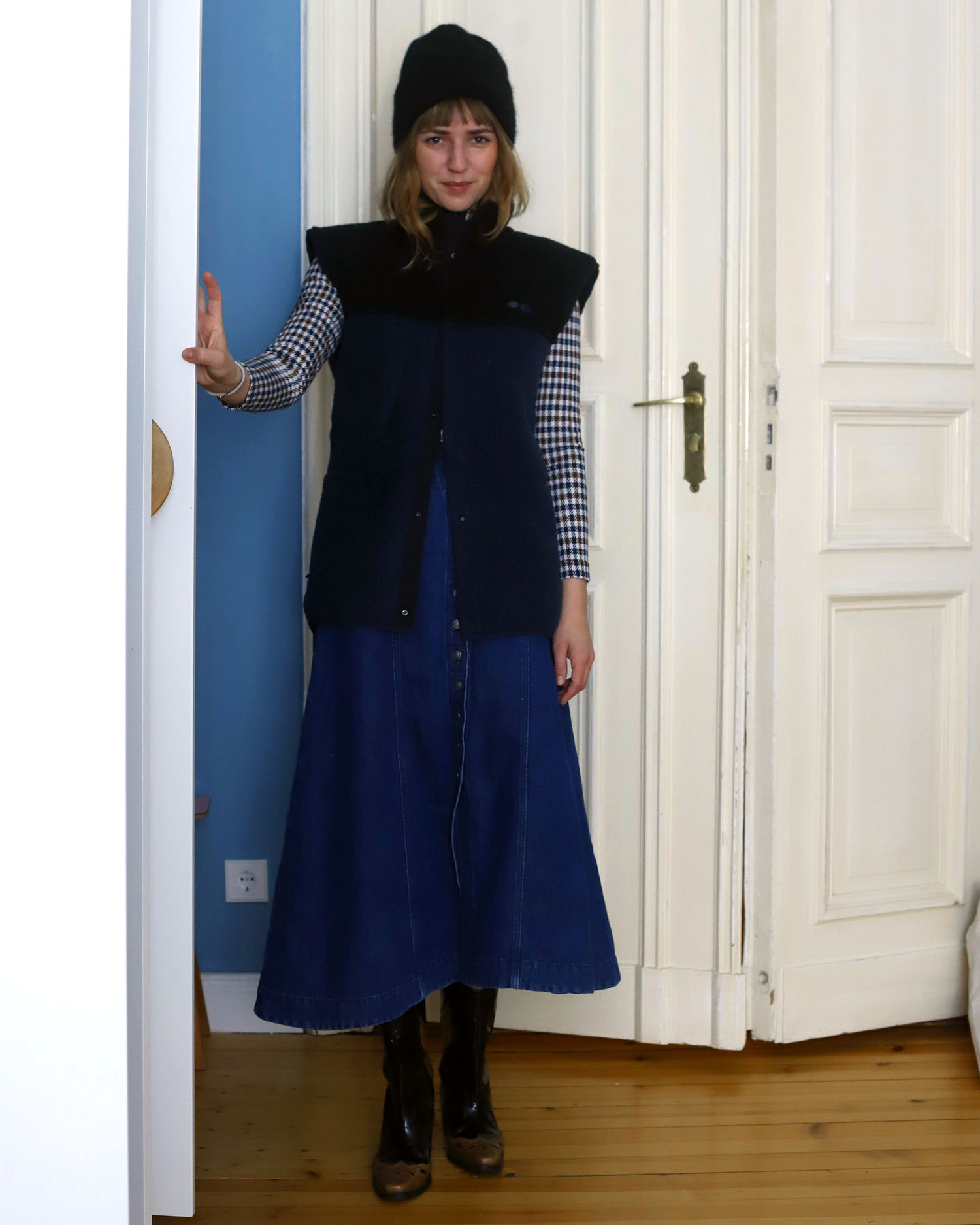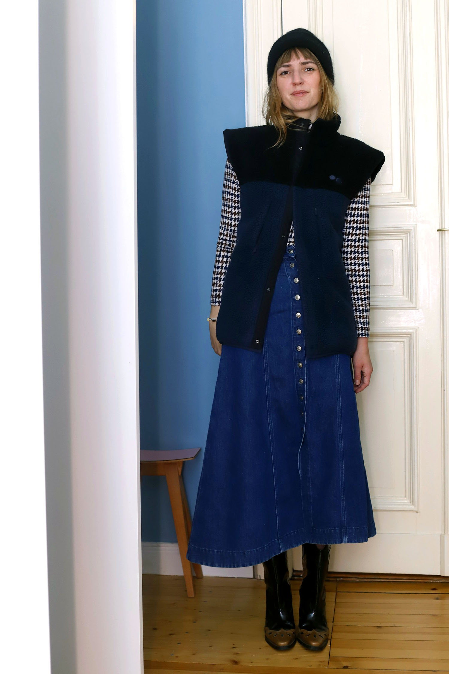 Shirt: Baum + Pferdgarten (älter), Weste: Pinqponq, Rock: Acne Studios (älter), Boots: Ganni, Mütze: Arket