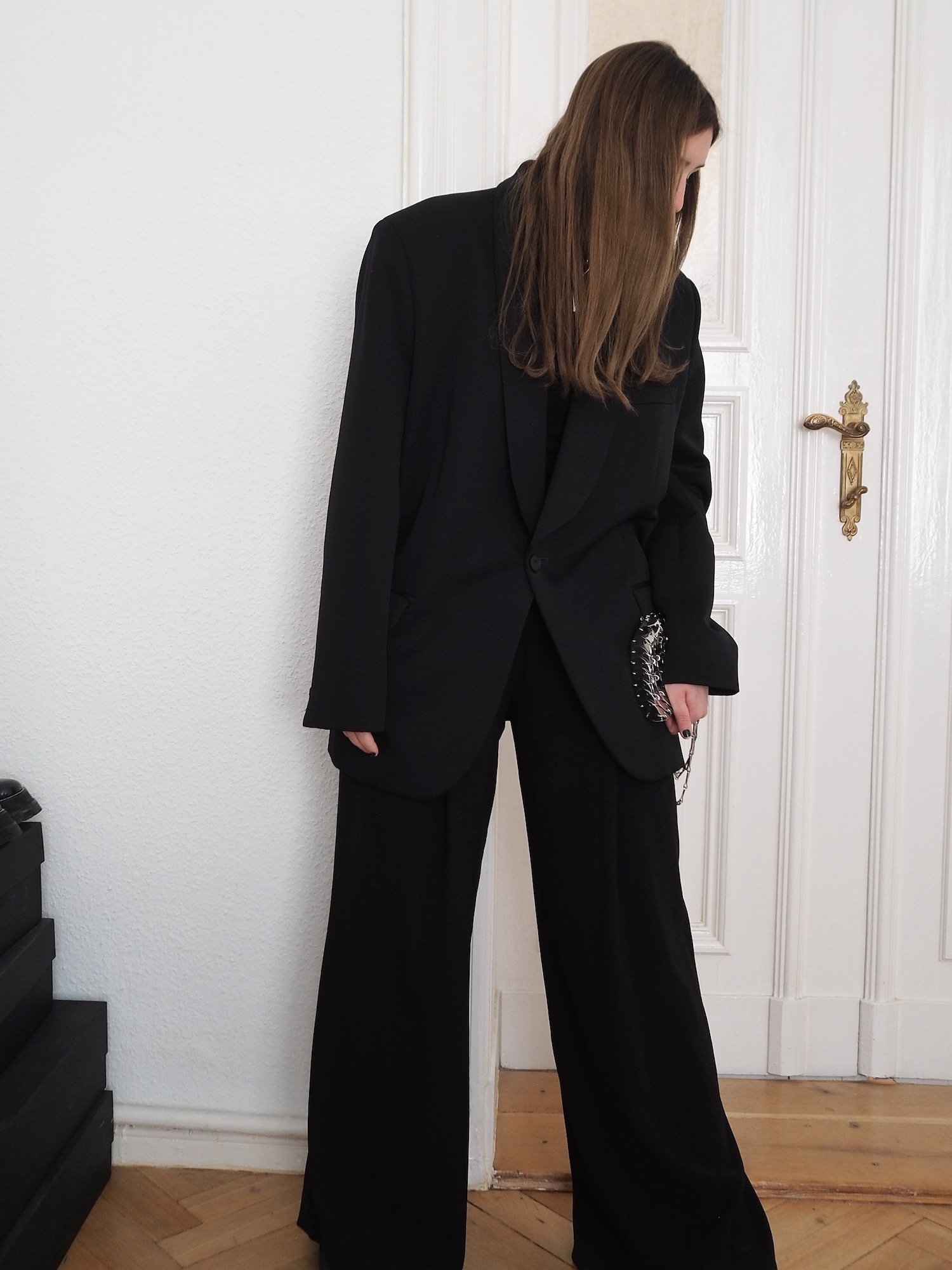 Blazer: Maison Margiela (ähnlich hier), Hose: MCQ (ähnlich hier), Pullover: Filippa K, Tasche: Paco Rabanne via Vestiaire Collective