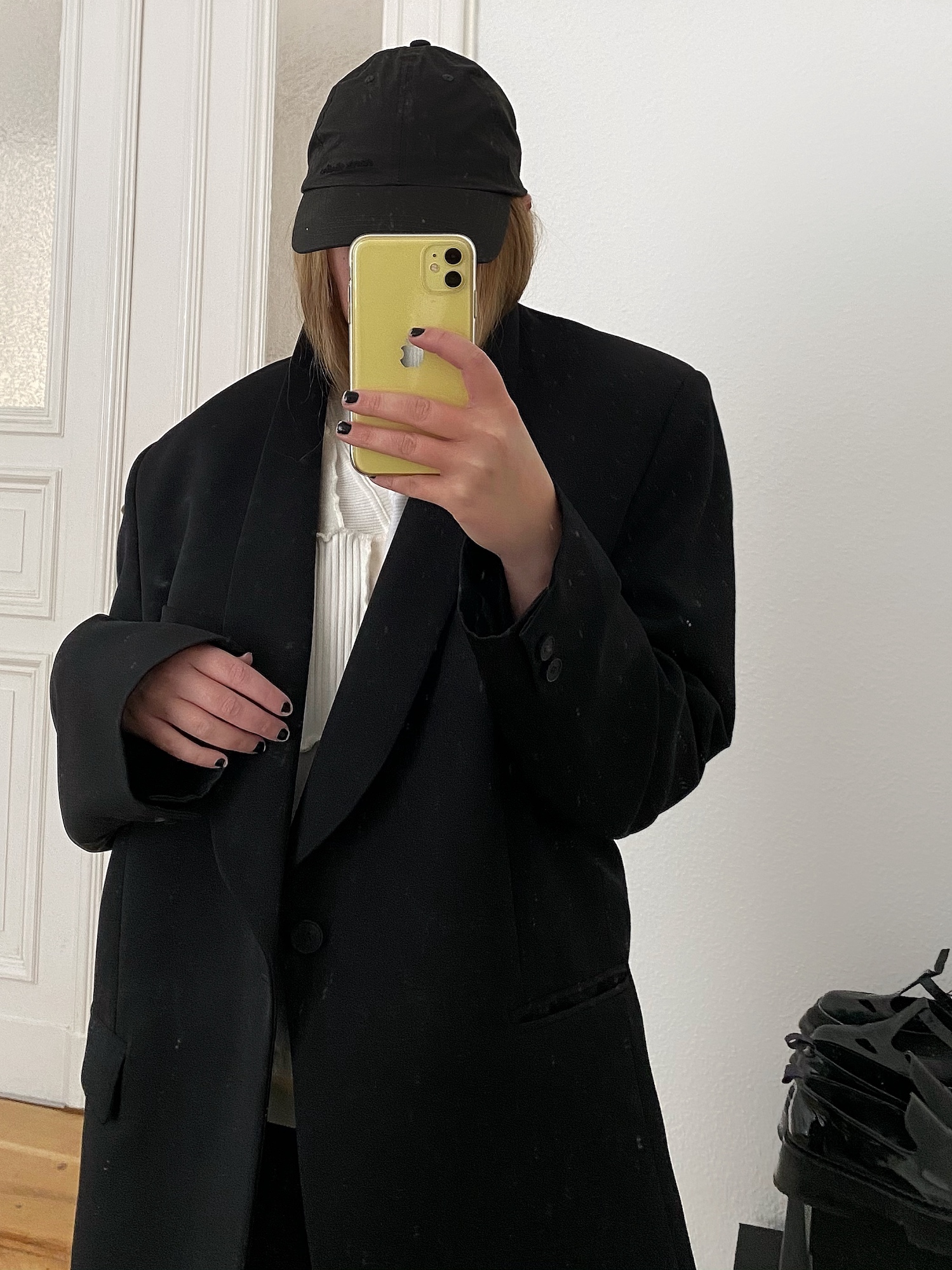 links: Blazer: Maison Margiela (ähnlich hier), Pullunder: Christina Seewald, Kappe: Acne Studios