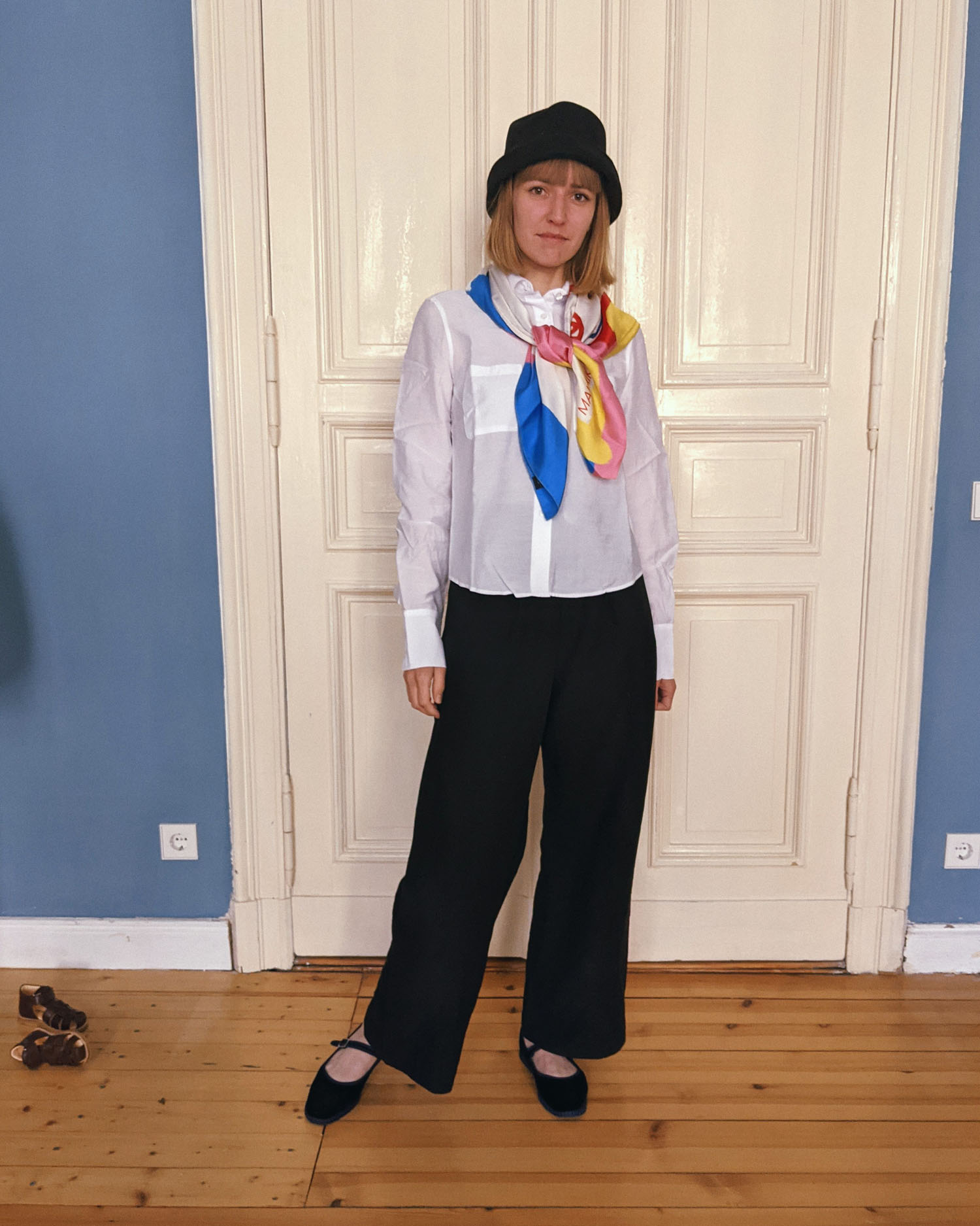 Hut: H&M (alt), Hemd: Filippa K, Hose: & Other Stories, Tuch: MALAIKARAISS, Schuhe: Vibi Venezia