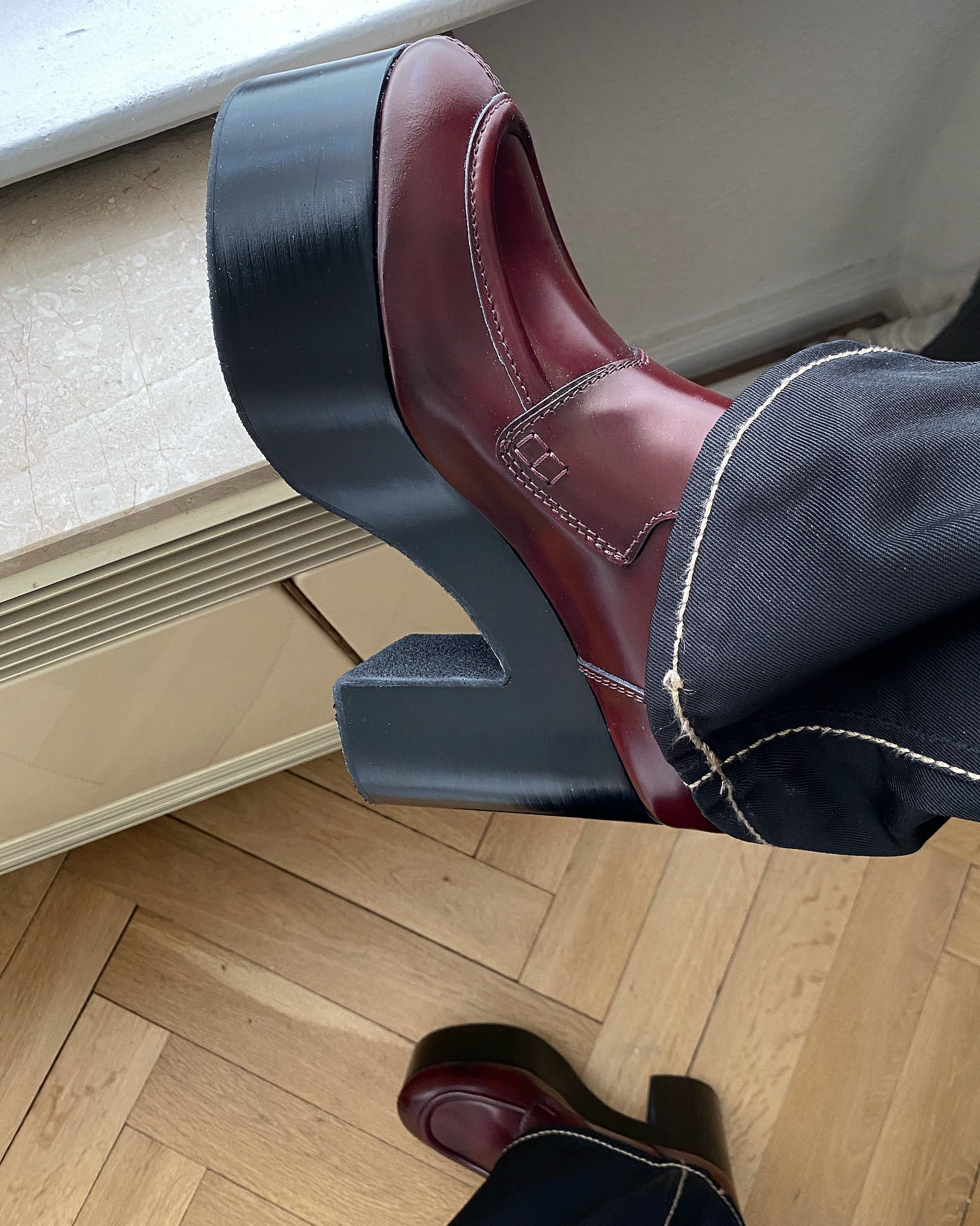 Meine Plateau-Loafer von Dries van Noten! Die schönen Stücke hatte ich vor einer Weile auf meine Wunschliste geschrieben, bevor ich sie dann tatsächlich (und unverhofft) im Sale gefunden habe. Ich war noch nie sonderlich gut darin, auf hohen Schuhen zu laufen, dieses Mal aber habe ich (auch dank Plateausohle) schon ein wenig in der Wohnung geübt und hoffe, sie bald auch endlich draußen ausführen zu können — mein einziges Kriterium: Es muss möglichst viele Sitzgelegenheiten geben, falls ich doch früher aufgeben muss, als mir lieb ist.