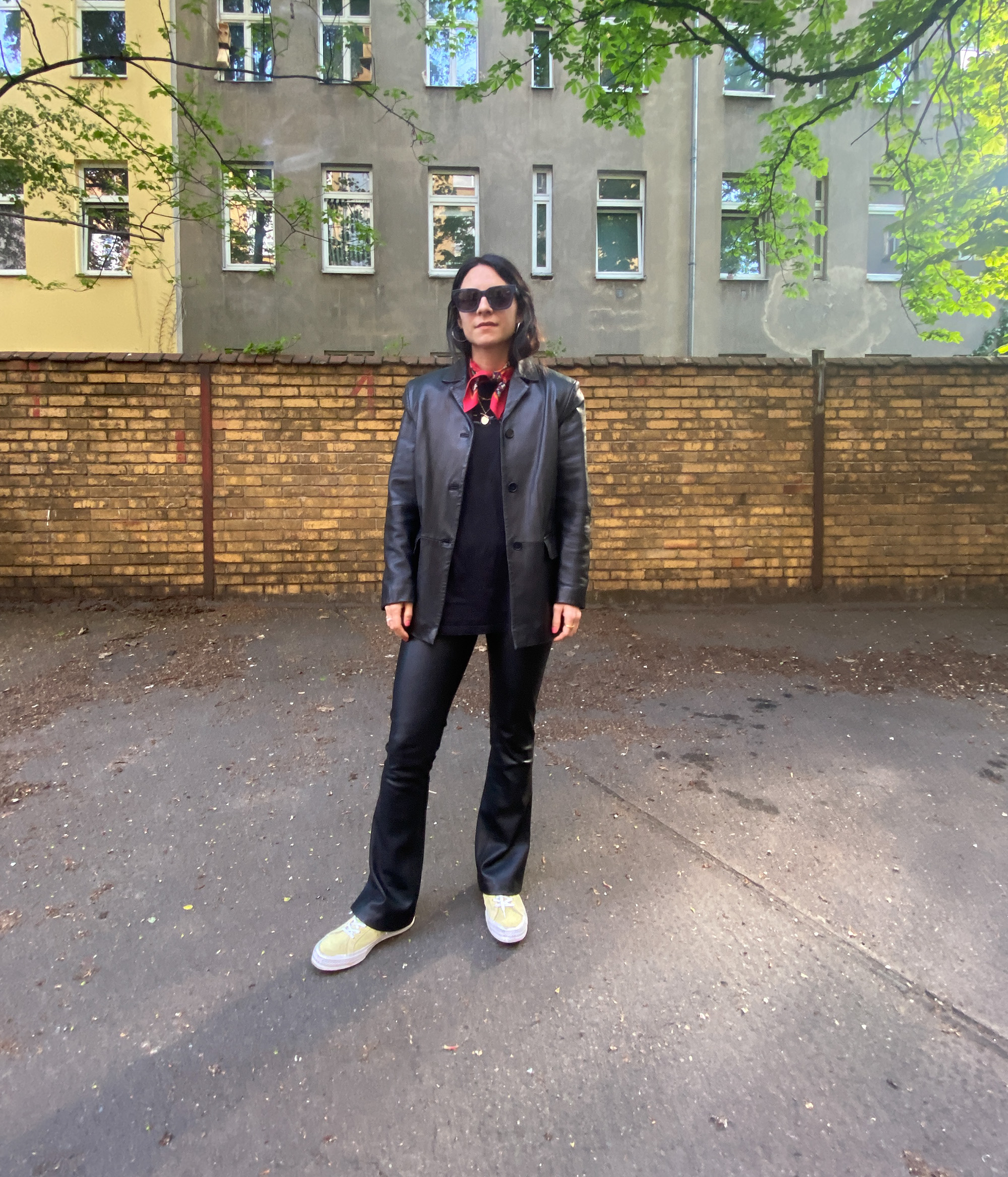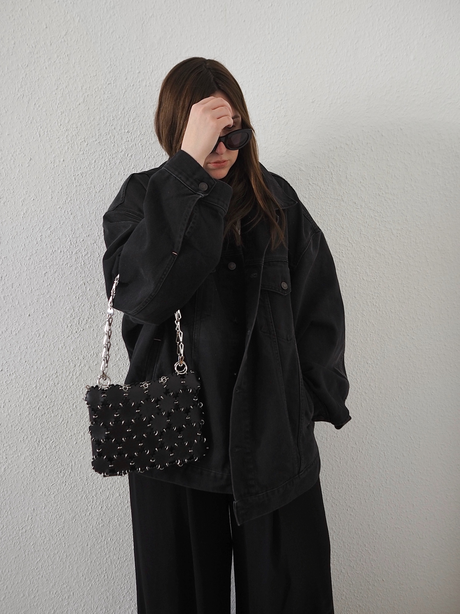 Jeansjacke: Acne Studios, Hose: MCQ (nicht mehr erhältlich), Sonnenbrille: Viu, Tasche: Paco Rabanne via Vestiaire Collective