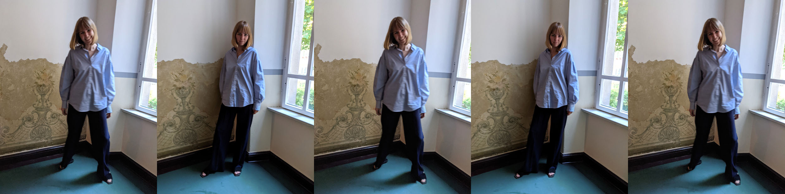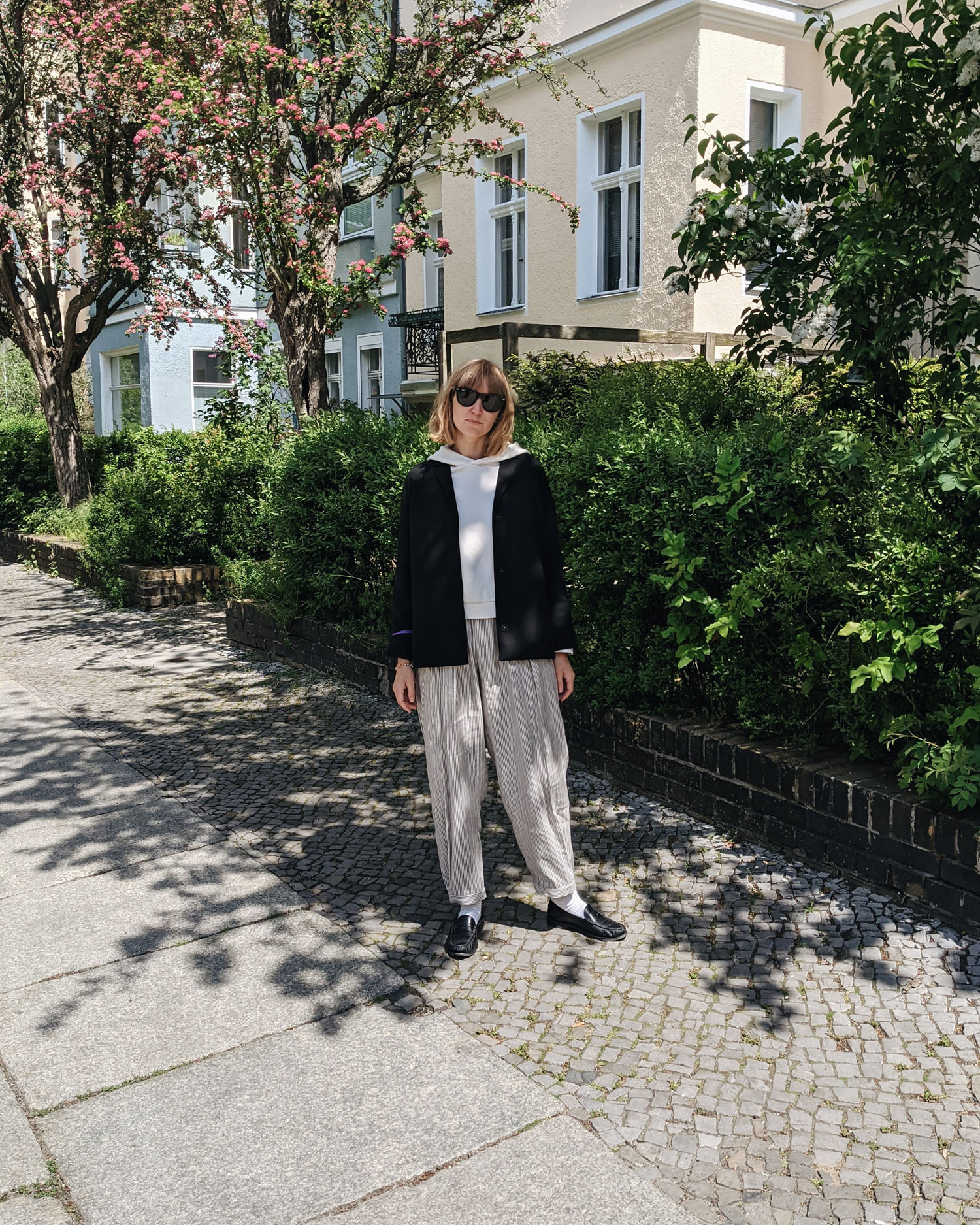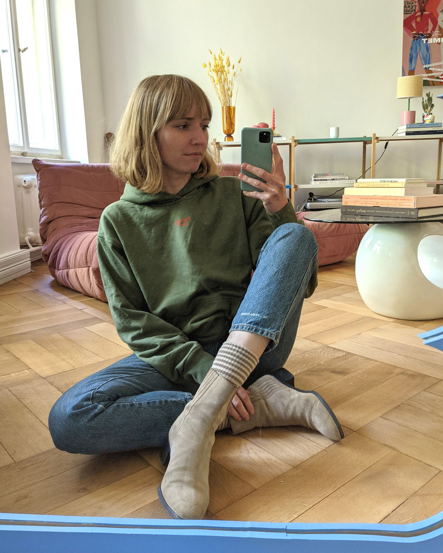 Ich verbrachte die ersten Frühlingstage in meinem geliebten Café, ging zum ersten Mal seit über einem Jahr draußen essen, fuhr viel mit dem Fahrrad und fühlt mich dabei so frei wie der Wind. Ich kaufte neue Bücher für die Kinder („Kiste“ für Wilma, ein erstes Freund*innenbuch zum Ausfüllen sowie „Herr Seepferdchen“ in Gedenken an den tollen Eric Carle und „Locken, Pony, Pferdeschwanz“ für Otto) und ergatterte endlich Nina Kunz‘ „Ich denk, ich denk zu viel„, nachdem es ständig überall ausverkauft war und konsumierte noch mehr: Glasteller und Glasfarbe zum Verzieren, Kinderkleidung und anderen Firlefanz. Ich fühlte mich so bereit für Lockerungen und war dann auch schon wieder total überfordert damit, hatte viel zu oft Herzrasen und schwelgte noch öfter schwer nostalgisch in vergangenheitsverliebten Erinnerungen. Ich fuhr zur Entspannung in die Schorfheide und trug ununterbrochen unspektakuläre Basics, in denen ich mich pudelwohl fühlte.