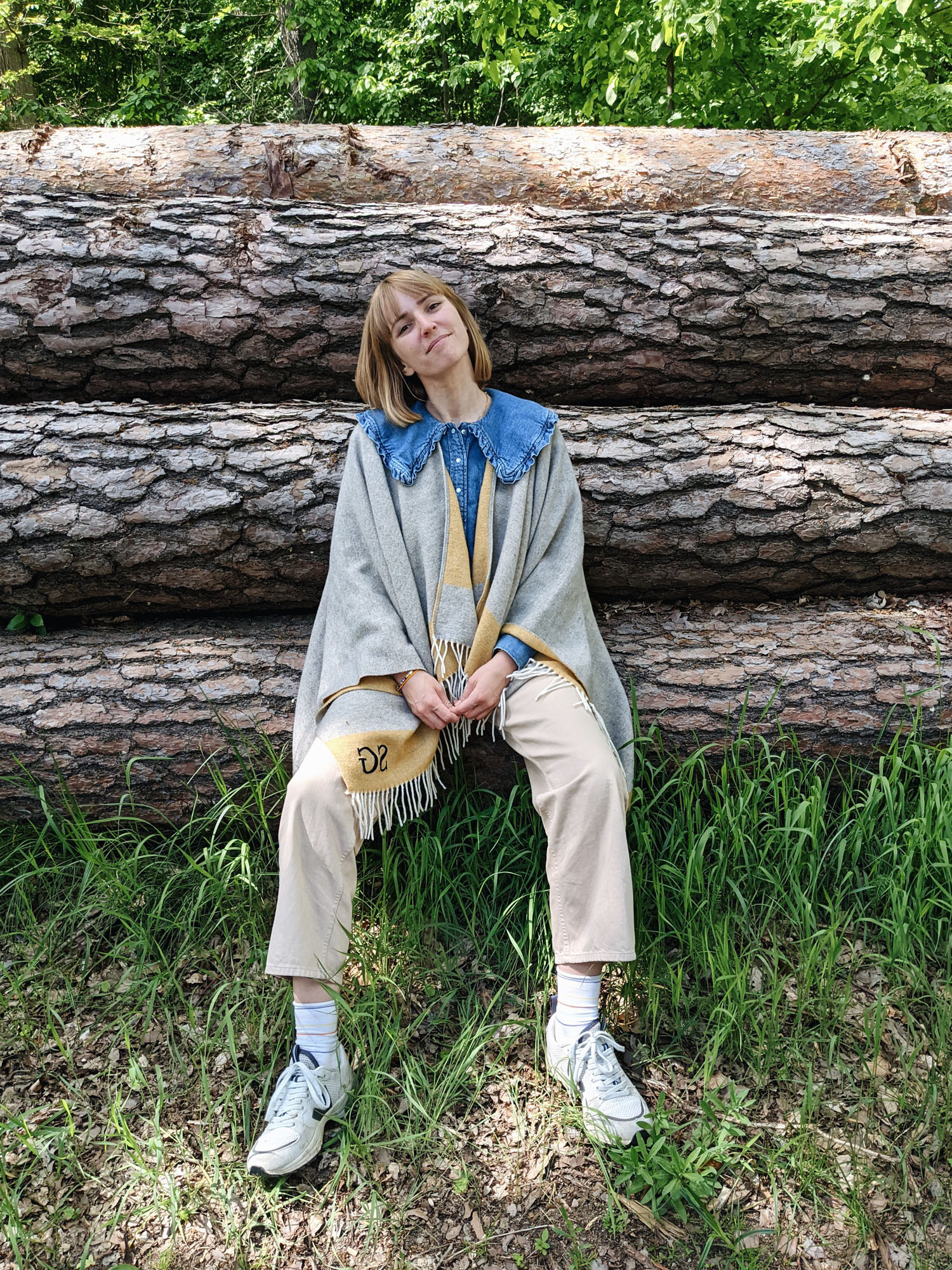 Jeanshemd: Ganni x Levi’s, Poncho: Das Cape Mädchen,
