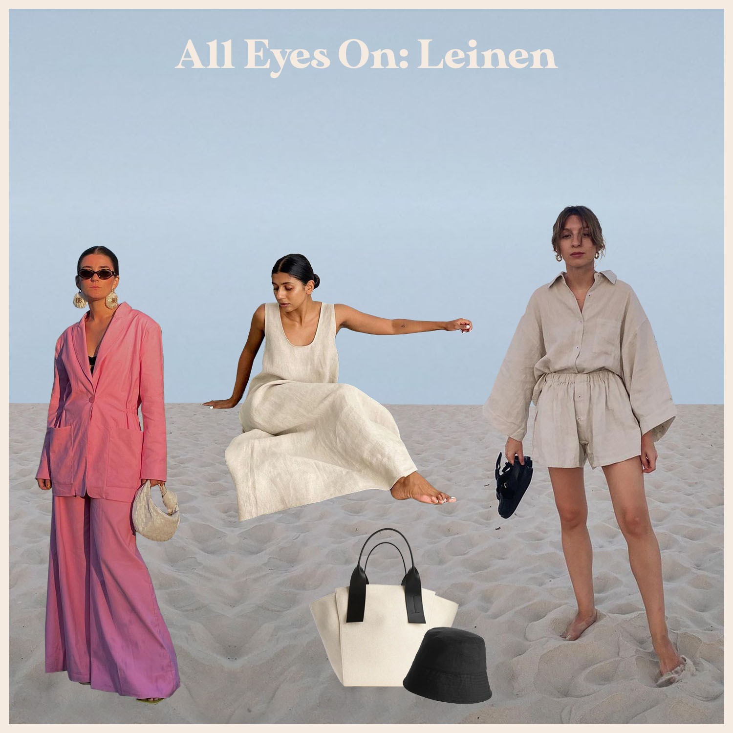 Ebenfalls bekannt für die häufige Verarbeitung von Leinen ist die britische Designerin Rejina Pyo, die sich in der Vergangenheit mit ihren geradlinigen Blusen und Kleidern einschließlich besonderer Knopfleiste einen Namen machte und schnell eine Fangemeinschaft um sich versammelte. Doch auch auf anderen Laufstegen gilt der Stoff schon lange als eines der wiederkehrenden Elemente. In den vergangenen Saisons waren modische Interpretationen etwa in Form eines bodenlangen, weißen Rocks (Miu Miu), eines Maxikleids samt Puffärmeln (Alexander McQueen) oder künstlerisch bemalten Anzügen (Acne Studios) zu sehen. Dass Leinen seinen Weg jedes Jahr aufs Neue in diverse Kollektionen findet, kommt dabei nicht von ungefähr, immerhin gilt das Material vor allem in den Sommermonaten als besonders leicht und angenehm. Obendrein lässt es sich mühelos kombinieren und je nach Anlass elegant oder lässig tragen. Was immer geht: locker geschnittene Anzüge, weit fallende Kleider und entspannte Hemden. Und weil wir uns derzeit bereits mitten im ersten Temperaturhoch des Jahres befinden, habe ich die vielleicht schönsten Kleidungsstücke aus Leinen — samt einigen ausgewählten Accessoires — für euch ausfindig gemacht: