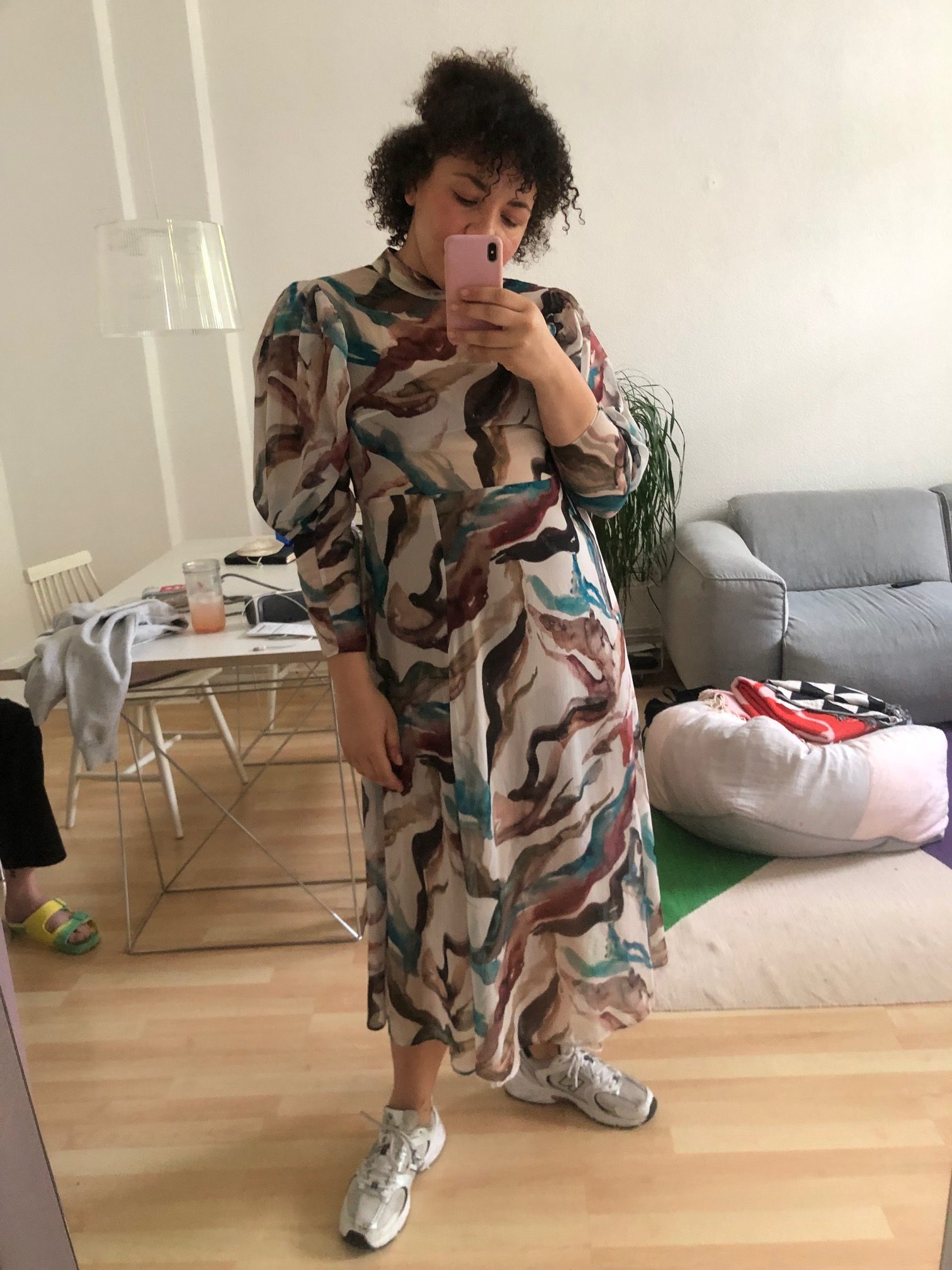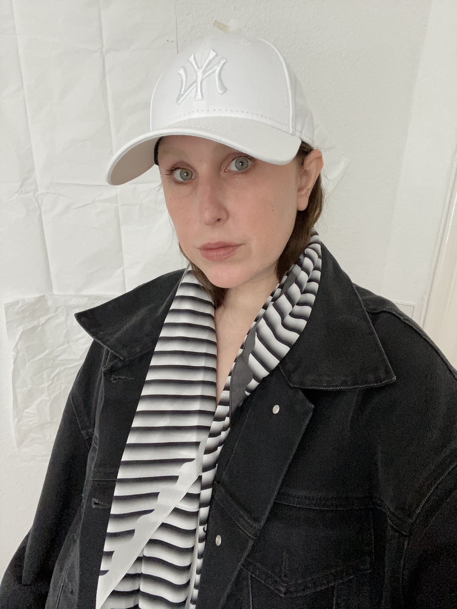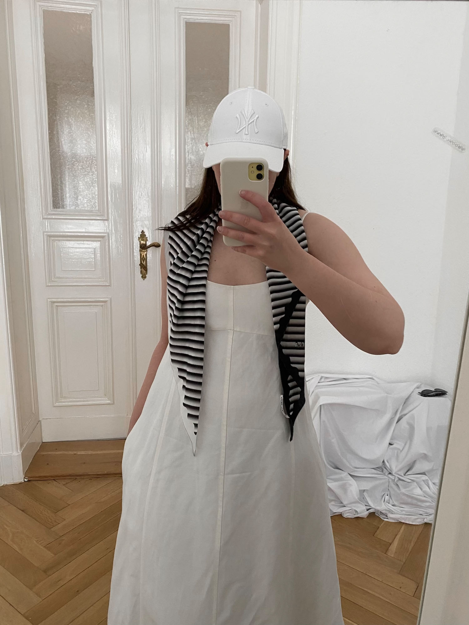 Kleid: Totême, Kappe: New Era, Schal: Quinta Maso, Jeansjacke: Acne Studios