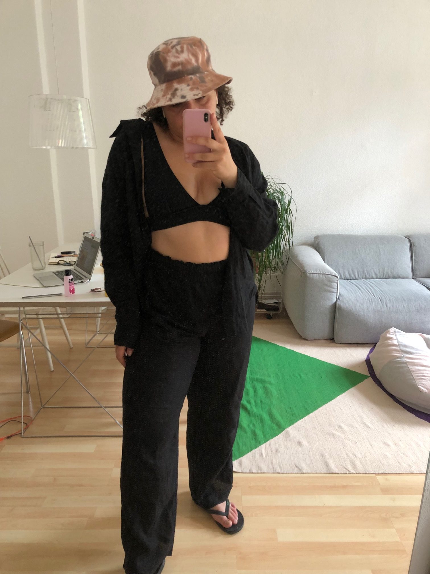 Leinenhose: H&M Leinenbluse: H&M Bikini: H&M Fischerhut: äter, ähnlich hier