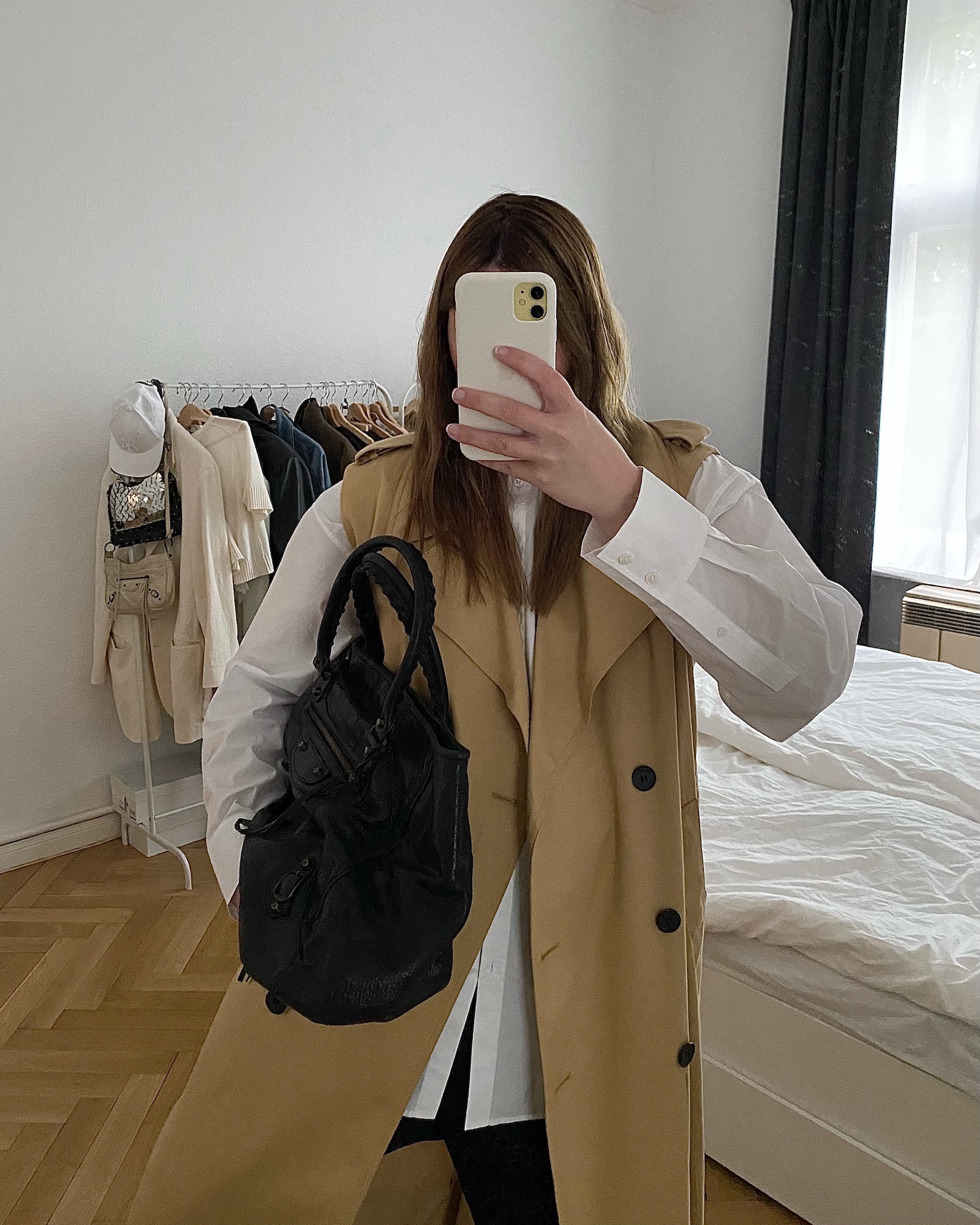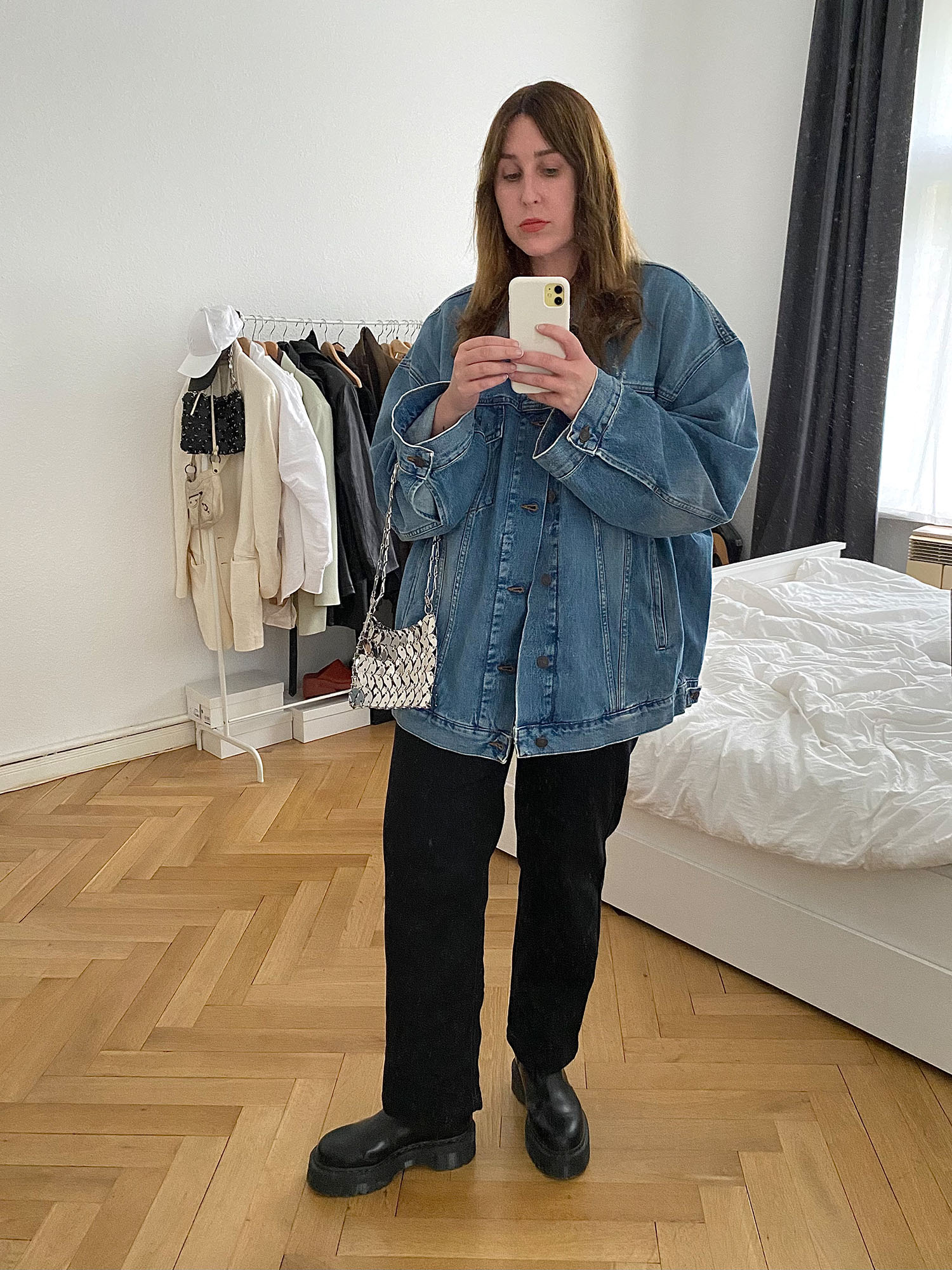 Jacke: Acne Studios, Jeans: Eytys (nicht mehr erhältlich), Schuhe: Dr. Martens, Tasche: Paco Rabanne via Vestiaire Collective