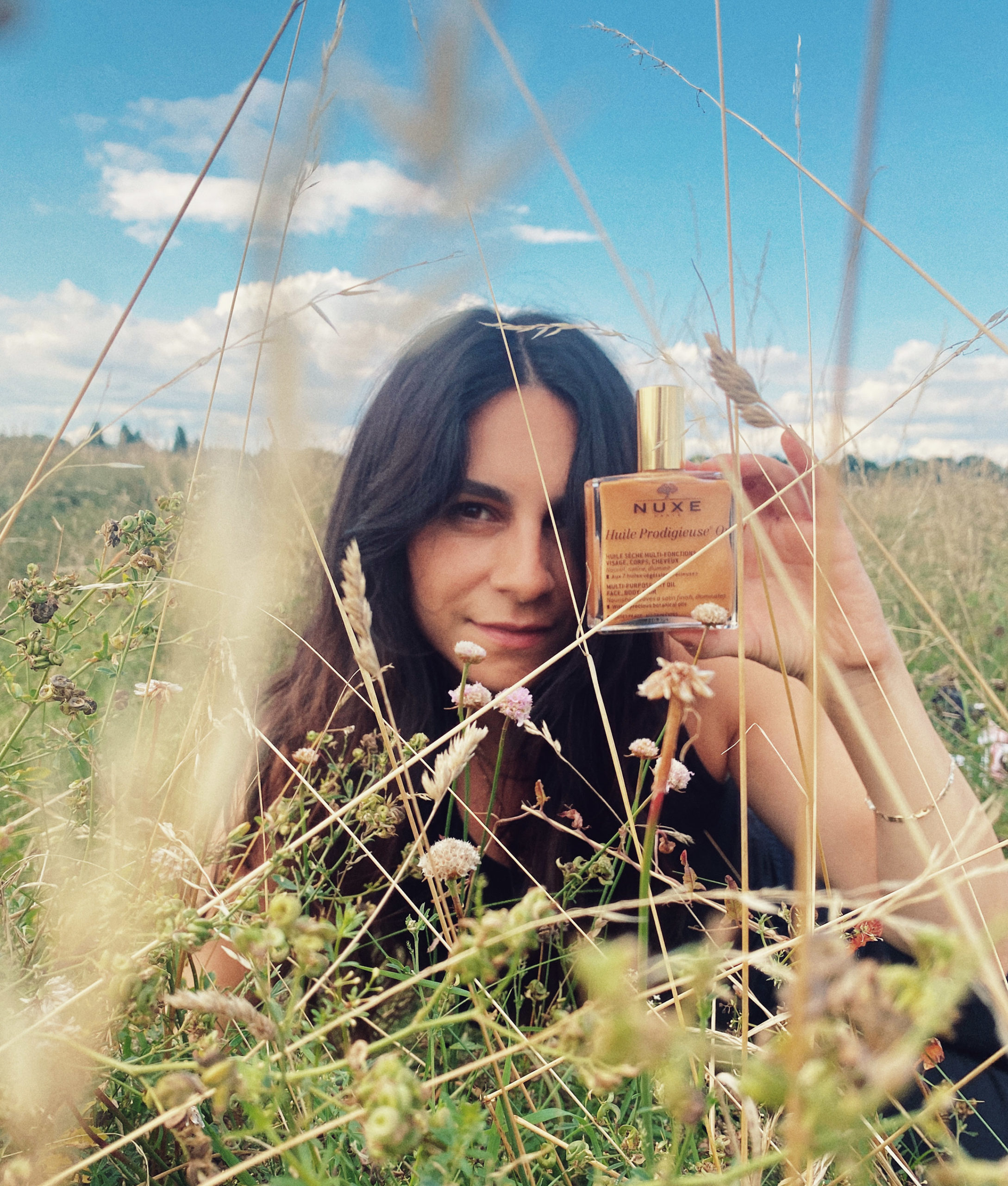 Der Duft ist für mich purer Sommer. Ich kann mir vorstellen, wie Sonnenstrahlen auf meine Haut treffen, während ich barfuß durch den Sand laufe. Das Trockenöl Huile Prodigieuse Or von Nuxe ist ein Urgestein in meinem Badezimmerschrank und wird, egal ob Sommer oder Winter, nach dem Duschen auf die noch leicht feuchte Haut aufgetragen. Im Sommer verwende ich gerne die Version mit Schimmereffekt. Süßmandel-, Kamelien-, Borretsch-, Argan- sowie weitere Ölen vereint mit goldenen Perlmuttpartikeln machen die Haut geschmeidig und bringen sie zum Glänzen. Dabei zieht das Öl super in die Haut ein, während der Schimmer kein Fettglanz, sondern ein Perlmutt ist. Für einen leichteren Schimmer auf dem Körper mische ich manchmal auch nur ein paar Tropfen in meine Bodylotion.