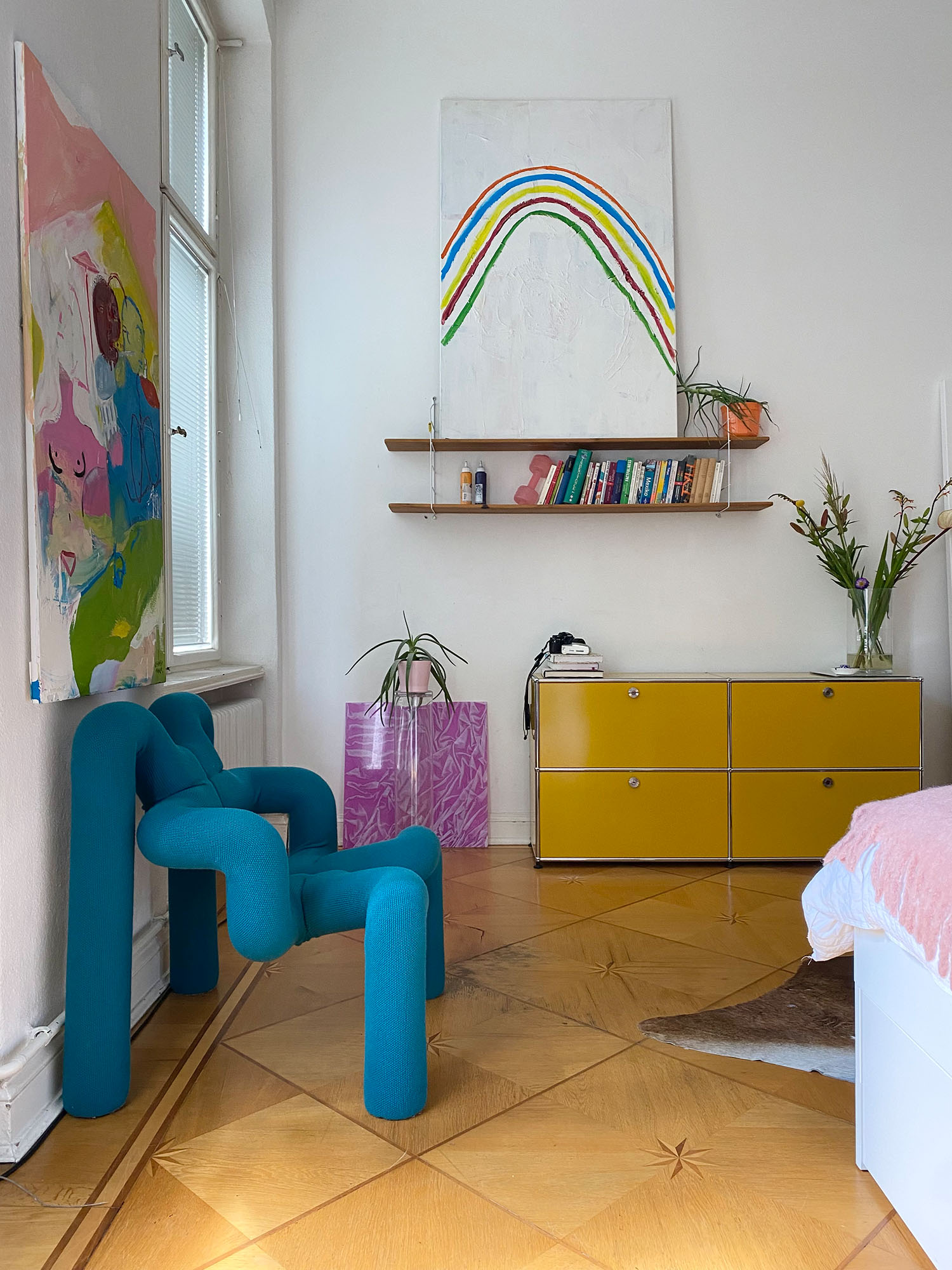 Mein Geburtstagsgeschenk von mir an mich, über das ich schon zu lange nachgedacht habe und das das einzig logische Pendant zu meinem okkafarbenden Kachelofen ist: Das gelbe USM Sideboard. Plus ich als Sessel: Ekstrem (so heißt das Modell) ist überraschend weich.