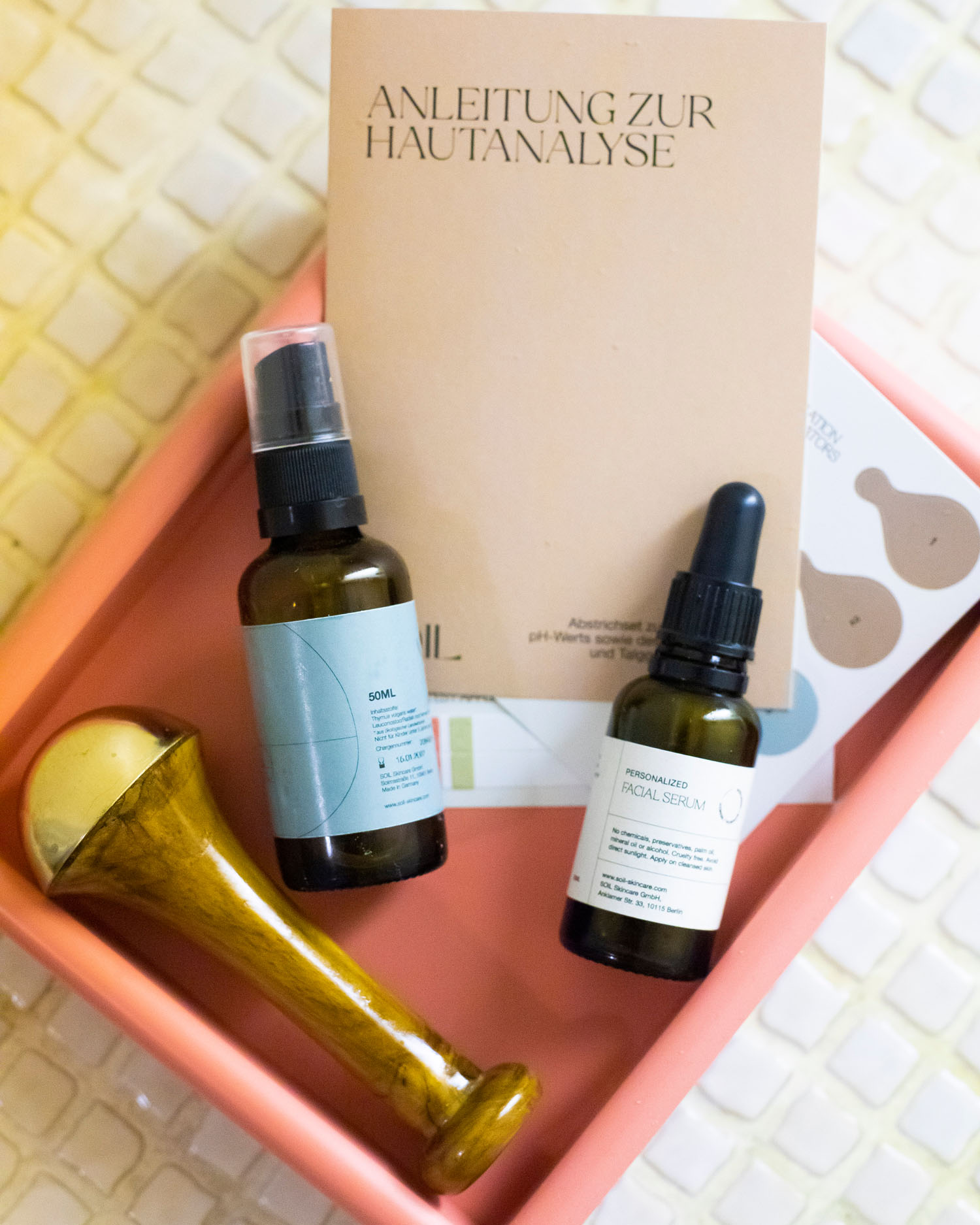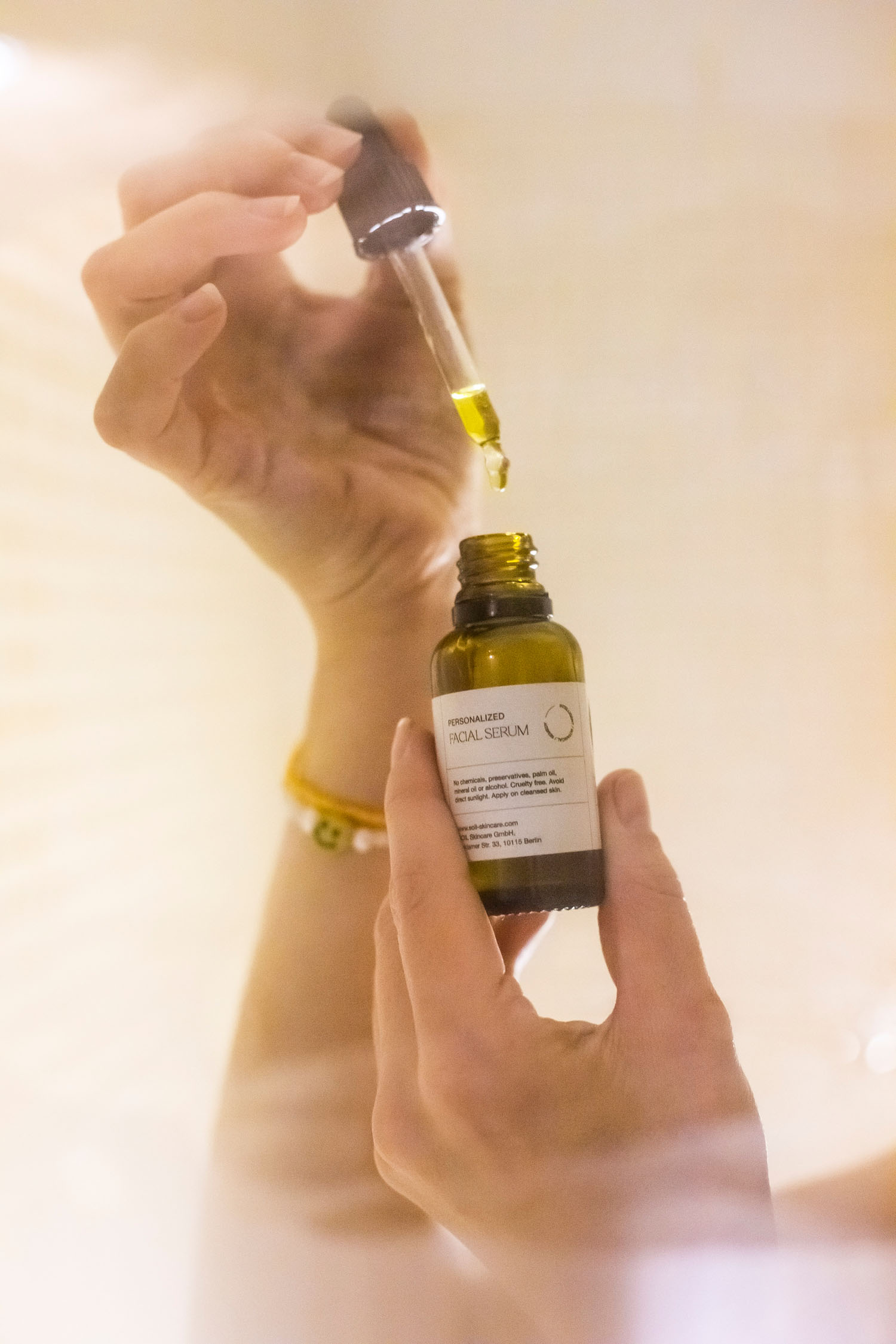 Ihr dabei wohl wichtigstes Produkt ist ihr personalisiertes Serum auf Öl-Basis. Wie oben bereits erwähnt, wird nach einer Online-Hautanalyse nach dermatologischen Standard-Scoring-Verfahren zu Symptomen, Lebensgewohnheiten und Ernährung die Rezeptur für Nutzer*innen Algorithmus-basiert errechnet und die Veränderung der Hautbedürfnisse durch eine regelmäßige Hautabstrichanalyse getrackt. Dabei untersucht das Team den pH-Wert, sowie Hydration- und Sebumgehalt (Talg, Hautfett)