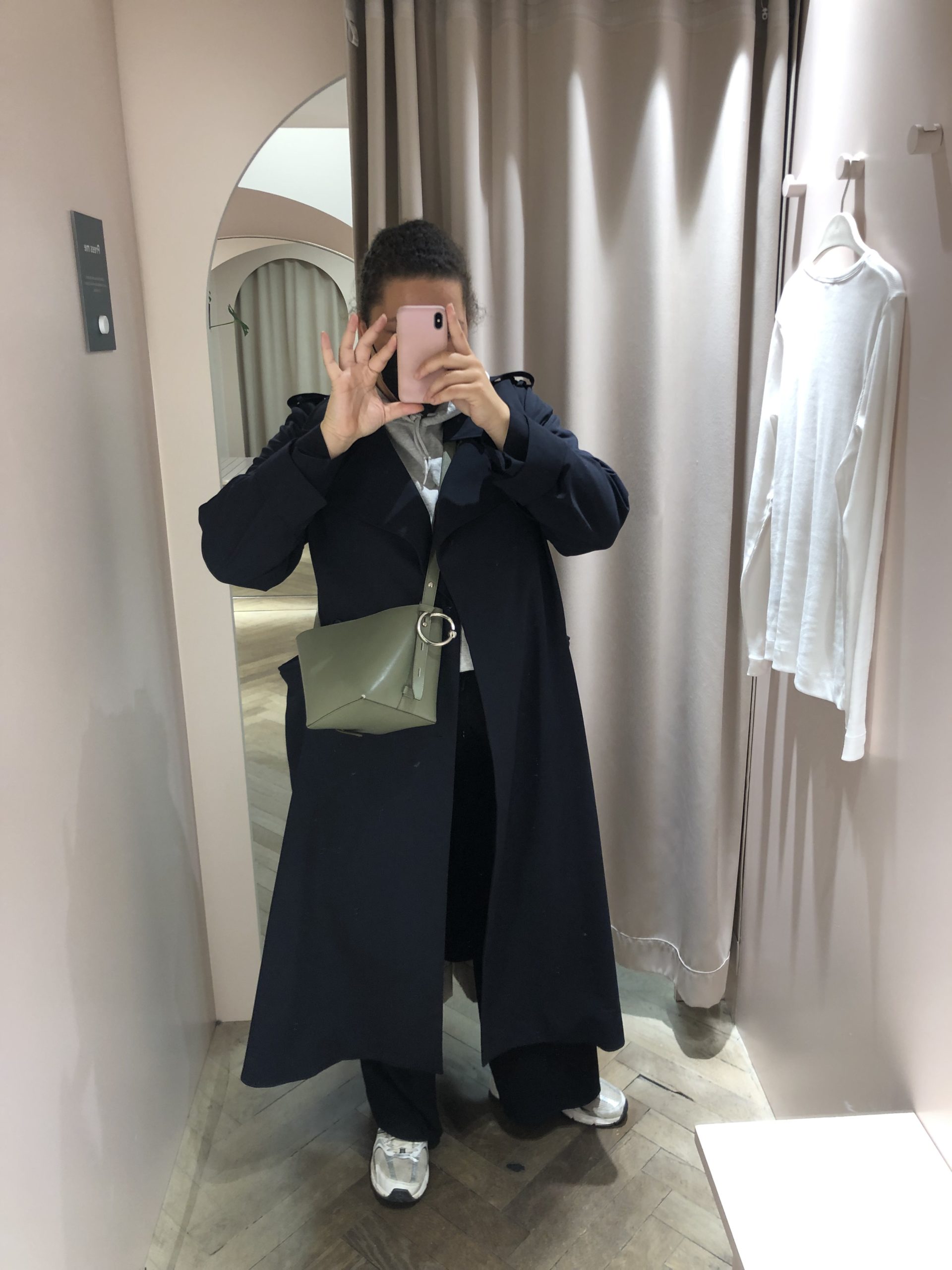 Mantel: COS, Tasche: Rebecca Minhoff, ähnlich hier, Sneaker: New Balance 530