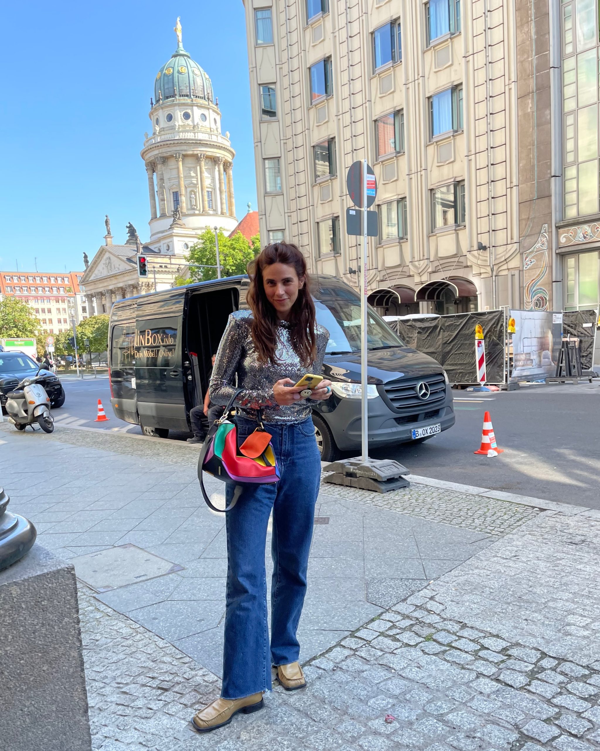 Top: Rodebjer, Jeans: Marques Almeida (2nd hand), Loafer: Jil Sander, Tasche: Loewe Puzzle Bag (von 2017)