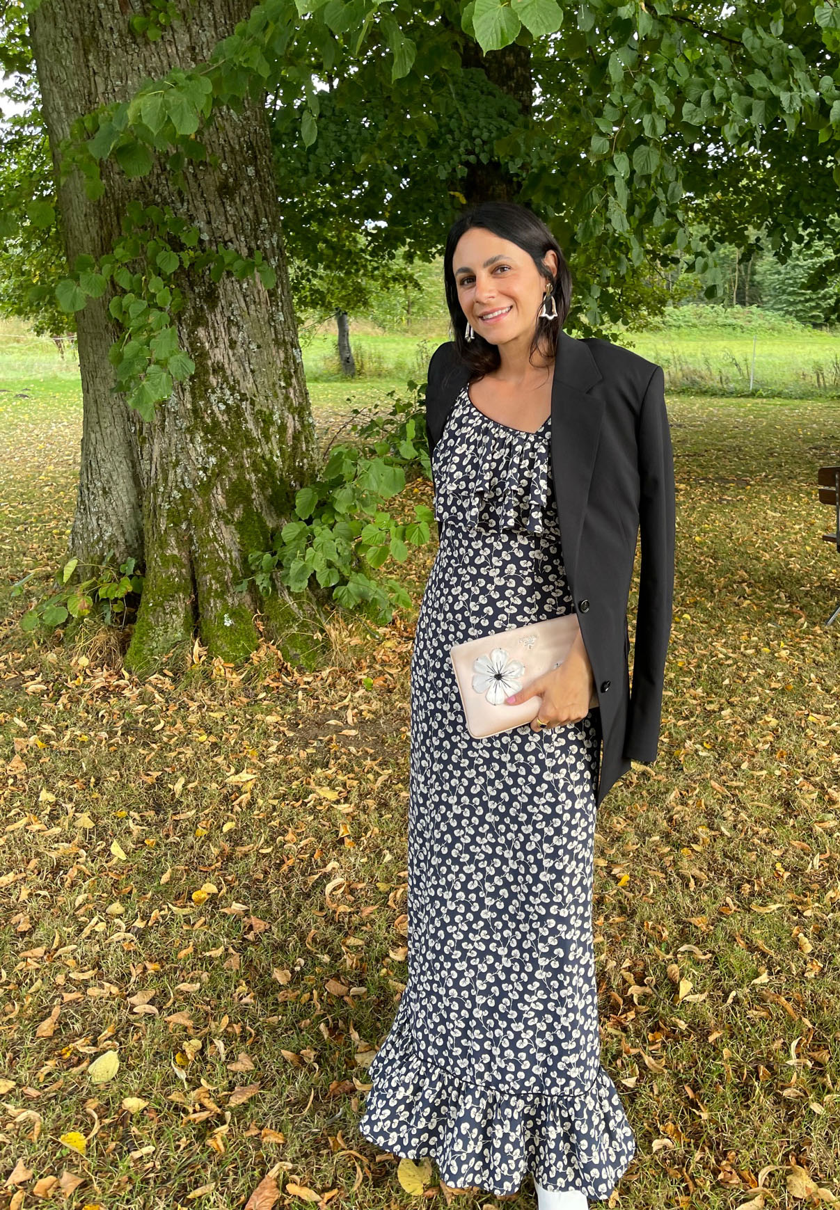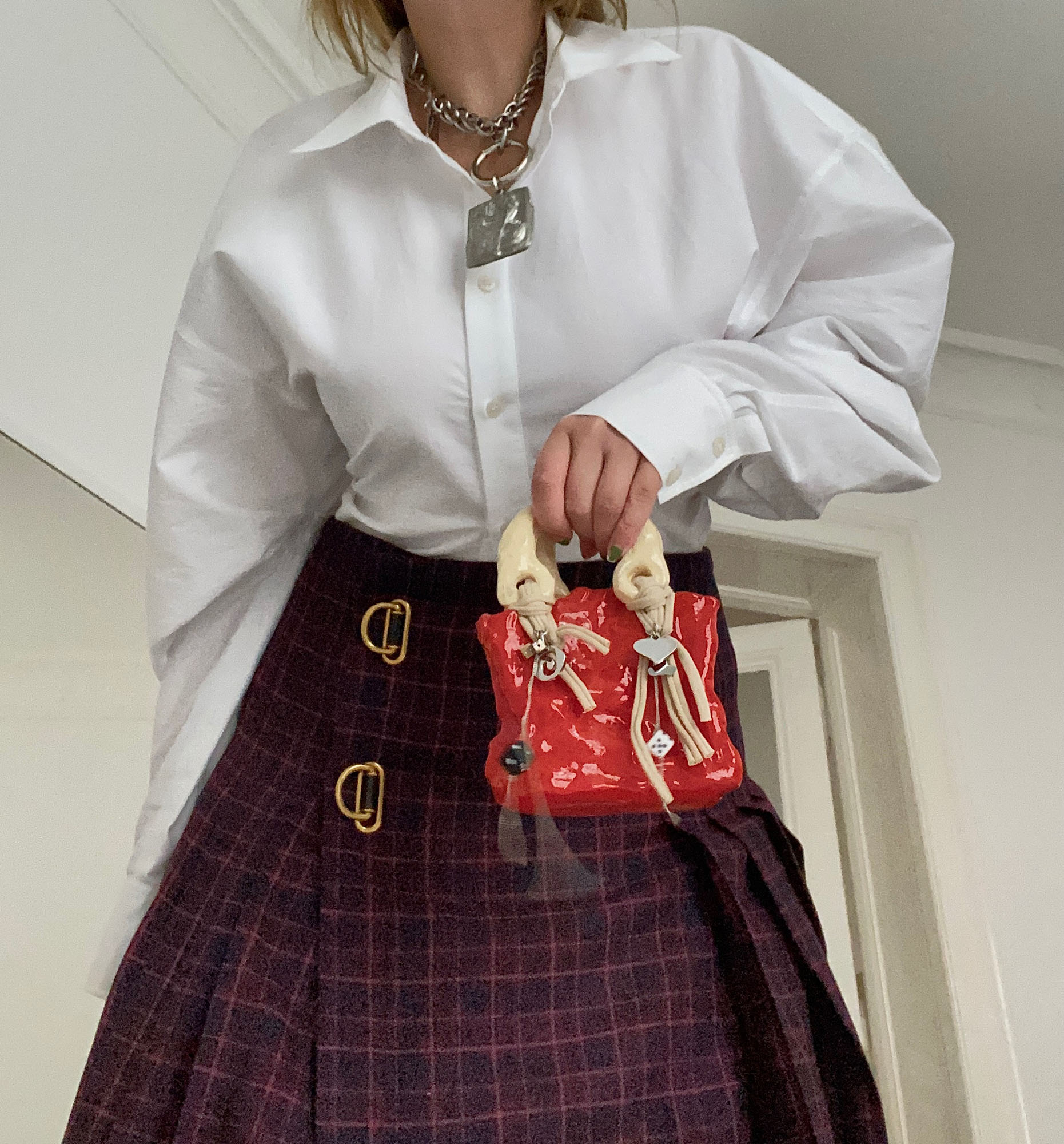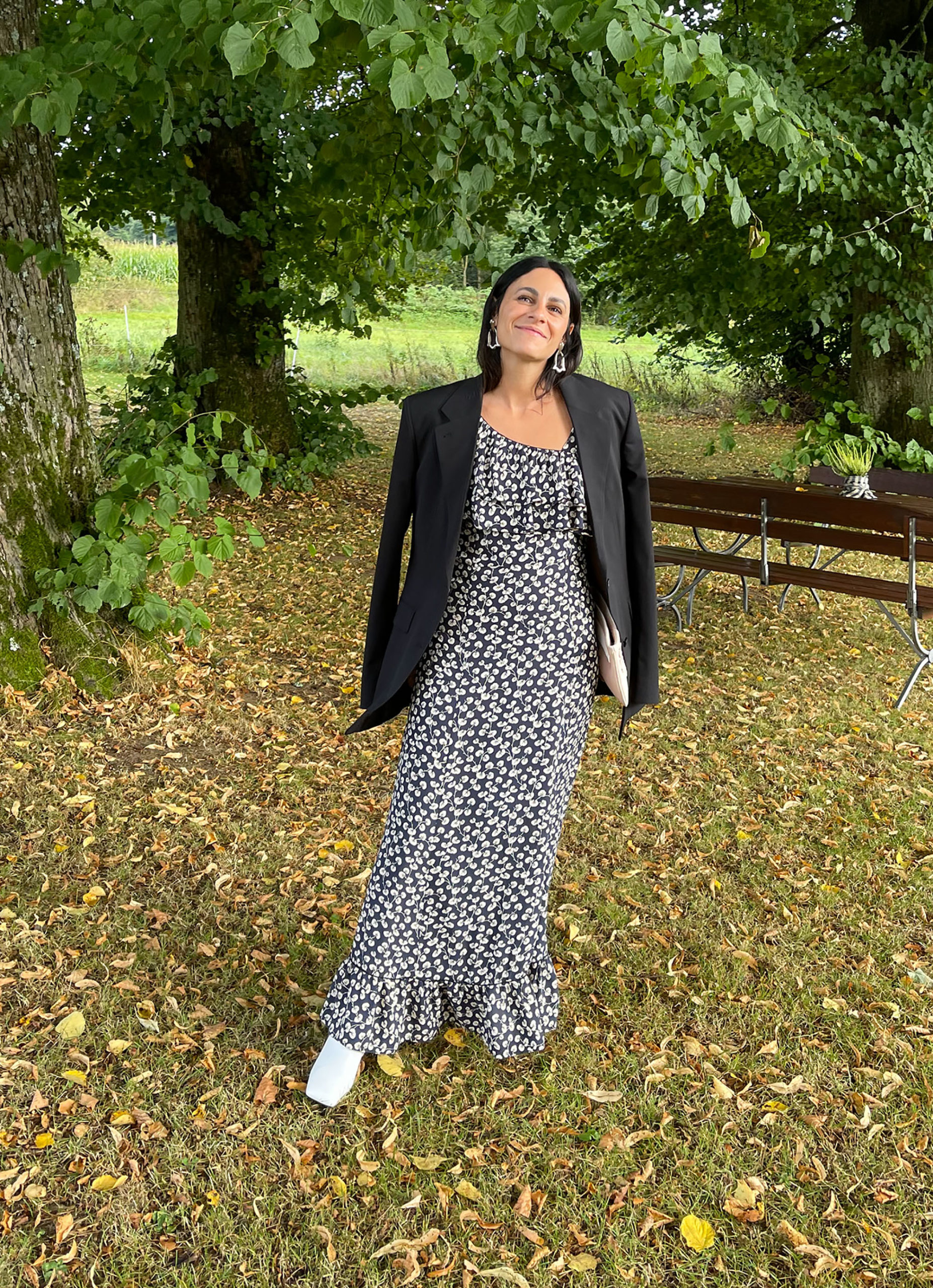 Jacke: Acne Studios (z.B. noch über Vestiaire Collective erhältlich), Kleid: Ganni (z.B. noch hier erhältlich), Paddle Boots: Bottega Veneta, Tasche: Rouje Paris