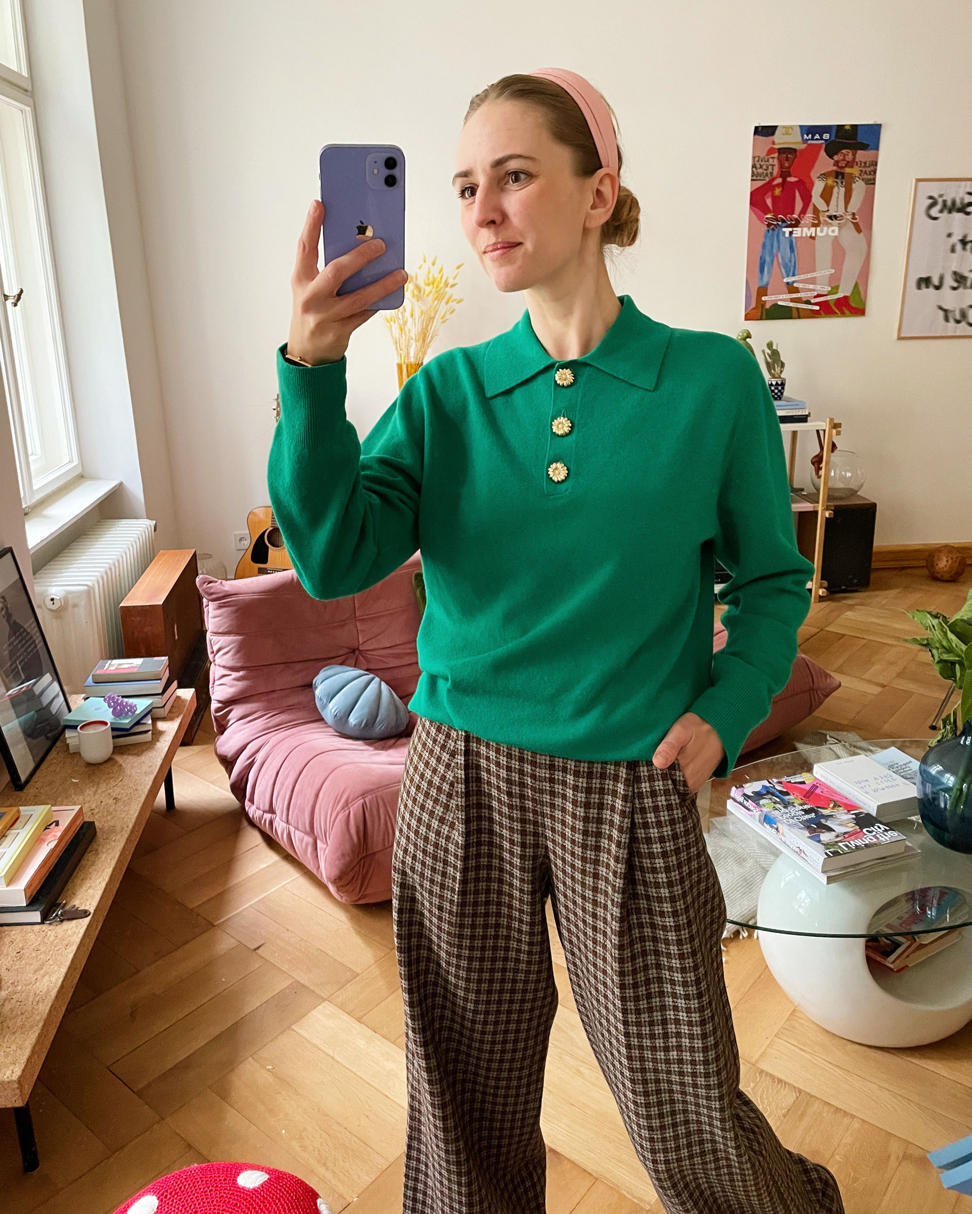 Neuerdings besitze ich einen Mixer und trinke grüne Smoothies, den Kaffee habe ich dennoch nicht aufgegeben (und werde es nie tun), dafür aber ist mein Spinat-Konsum gestiegen, was ja auch nicht schlecht ist. Ansonsten ist es da draußen unverschämt kalt geworden, weshalb ich schon im September die Heizung neben mir anschiele und zugleich die schlechte Isolierung verfluche. Gegen die frische Brise gibt es nachmittags dann aber doch nur einen Tee und dicke Socken sowie die Erkenntnis, dass es mir wie jeden Herbst und Winter an warmen Pullovern mangelt. Was ich außerdem tat: Wählen (ich bin Briefwahl-Fan), lesen („Second Place“ von Rachel Cusk — es läuft eher schleppend), Musik hören („Wouldn’t You Know“ von Royal Headache) und die internationalen Modewochen verfolgen (meine bisherigen Favoriten: Eckhaus Latta, KNWLS, Maximilian Davis, Peter Do und Thom Browne).