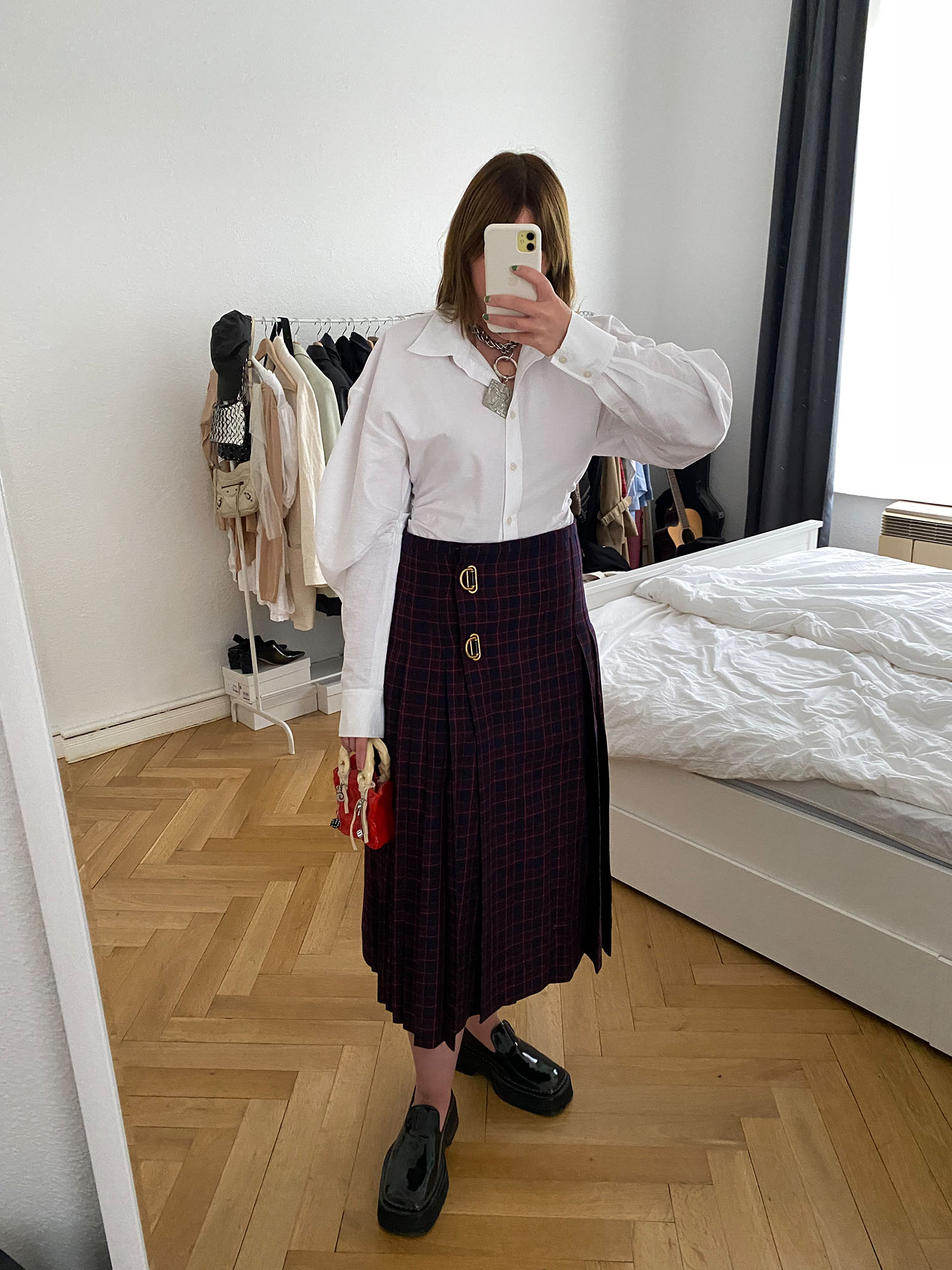 Bluse & Hose; 2nd Hand, Schal: Gucci, Loafer: Jil Sander