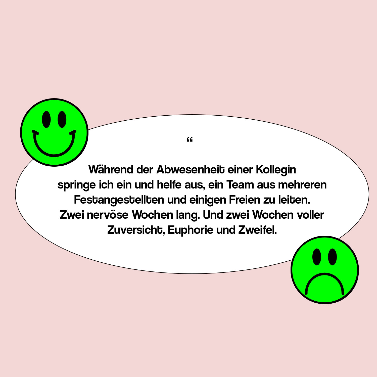 Auch wenn ich heute ganz andere Betriebe kenne, solche mit viel Wertschätzung und Sanftheit, Zeit zum Reden und Rücksicht, sollte mich diese Lebensphase bis heute prägen. Denn auch wenn es bald acht Jahre her ist, bleibt die Erinnerung an schlechte Stimmung und Überstunden, selbst wenn es durch Verständnis und Nachsicht erweitert wurde. Die Dynamiken, denen eine Führungsposition unterliegt, zu verstehen, hat lange gedauert und ist vielleicht aktueller denn je. Denn während der Abwesenheit einer Kollegin springe ich ein und helfe aus, ein Team aus mehreren Festangestellten und einigen Freien zu leiten. Zwei nervöse Wochen lang. Und zwei Wochen voller Zuversicht, Euphorie und Zweifel.