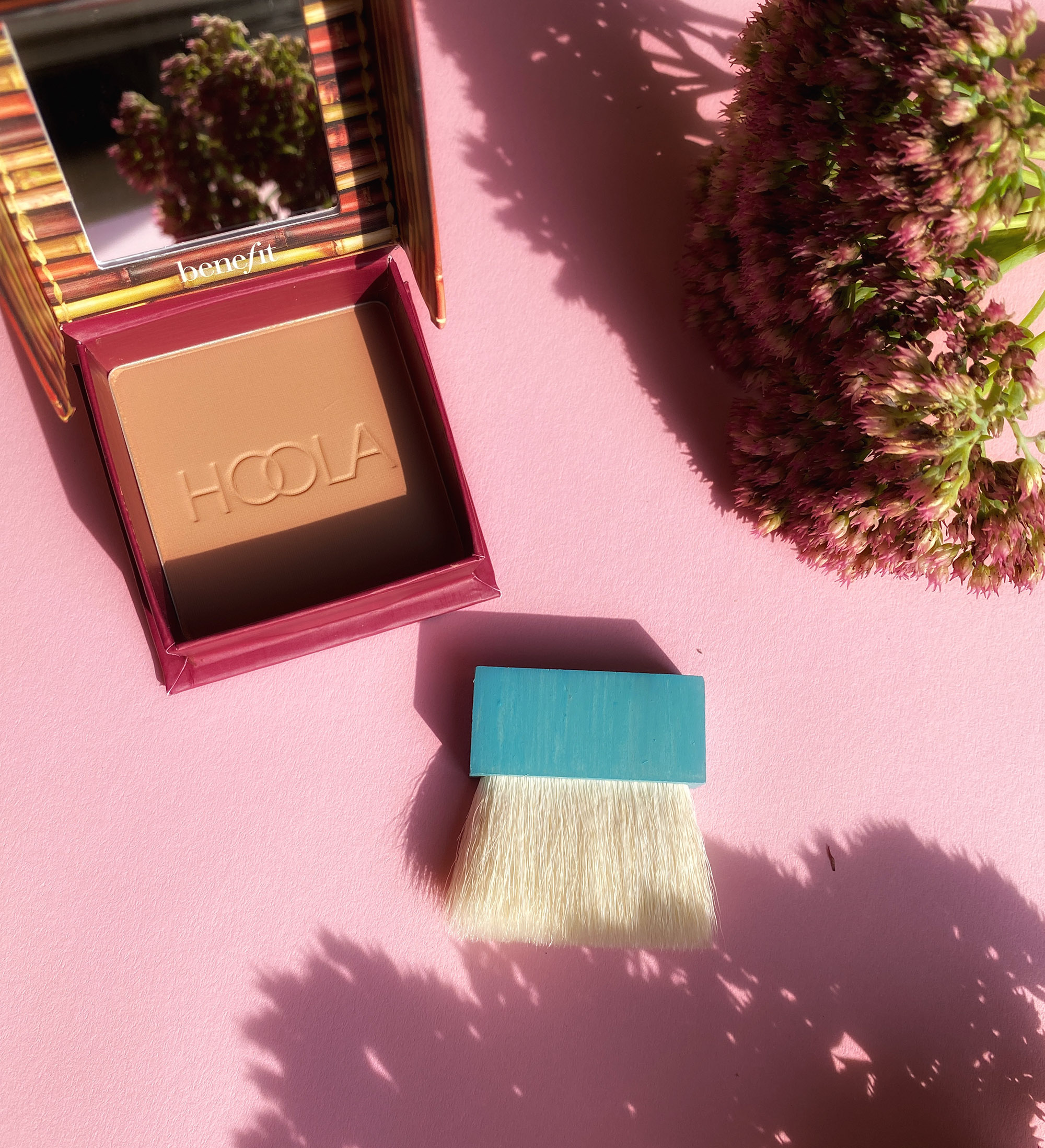 Ein Bronzer soll dem Gesicht mehr Tiefe und Wärme geben und Sonne imitieren. Deswegen kommt er genau an die Stellen, auf die die Sonne als Erstes eure Haut im Gesicht treffen würde. Ich finde, man kann sich das Ganze gut in E-Form vorstellen: Also am Haaransatz entlang, angefangen oben an der Stirn, dann auf die Wangenknochen und ein bisschen am Hals, genau dort, wo die Kieferknochen sind, um die Kieferkontur zu schärfen. Dann noch einen Klacks auf den Nasenrücken und fertig. Der Hoola Bronzer von Benefit gehört wohl zu den bewährtesten Produkten auf dem Markt und in meinem Beautyschrank. Er kommt in vier unterschiedlichen Tönen und lässt sich ganz einfach mit einem Pinsel auftragen, ohne dass harte Kanten entstehen. Das Finish ist matt.