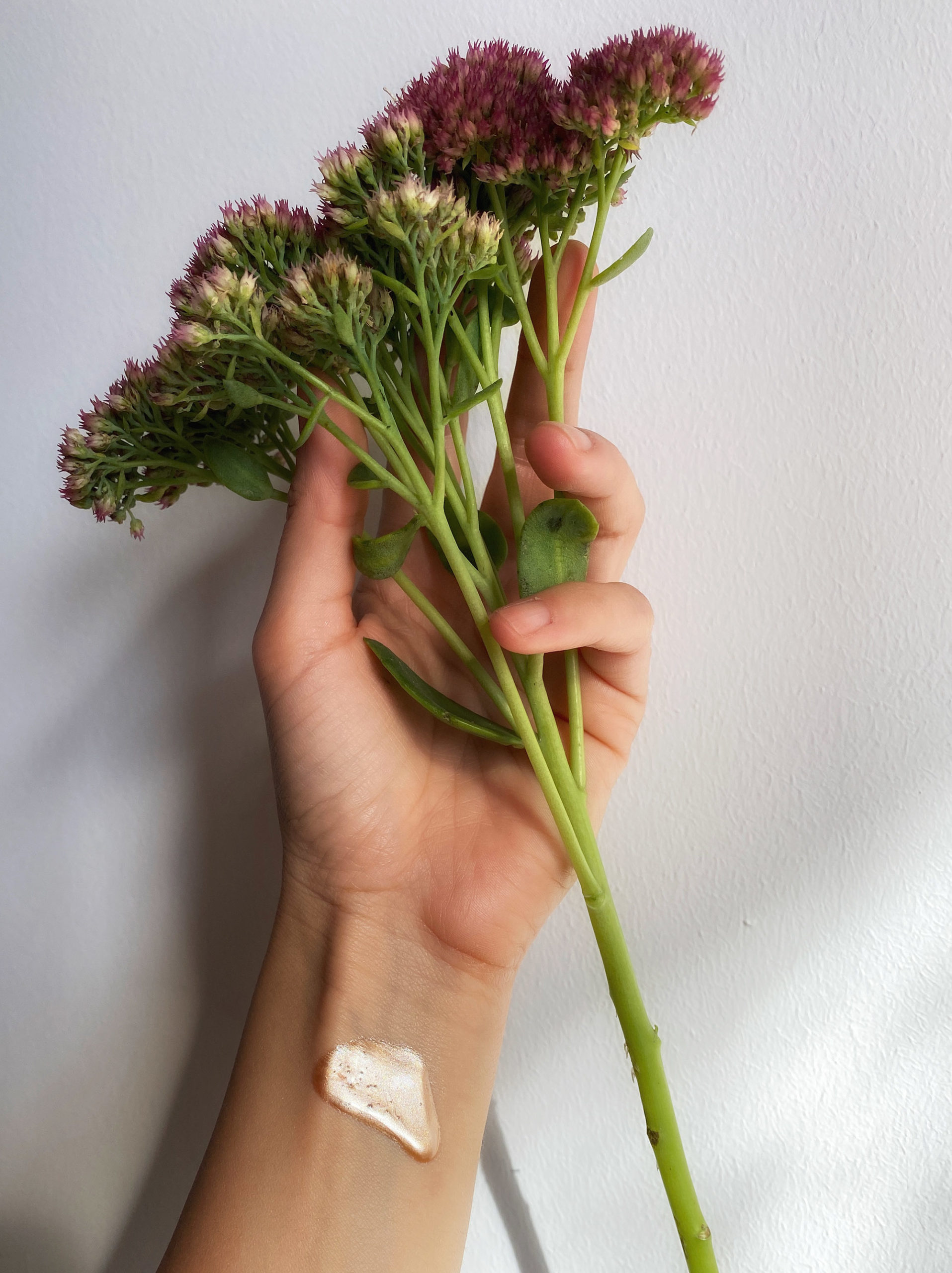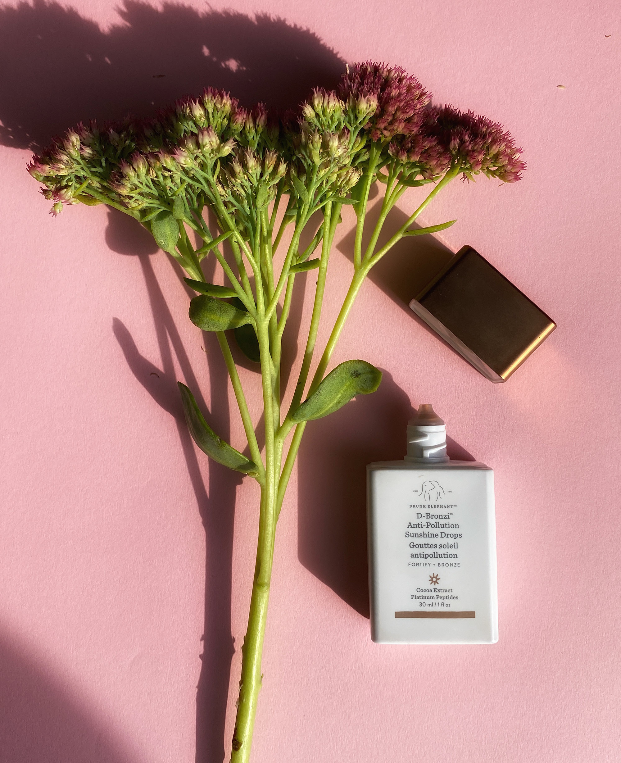 Während wir noch den Primer auftragen, kommt der zweite und bedeutende Schritt in dieser Make-up-Routine. Ich gebe ein bis zwei Pumpstöße von dem Primer in meine Handfläche und vermische diese mit zwei Tropfen des D-Bronzi Anti-Pollution Sunshine Drops von Drunk Elephant. Diese kleine Flasche macht ihrem Namen wirklich alle Ehre. Egal ob mit Primer, Creme oder Öl, einmal vermischt und auf die Haut aufgetragen, sieht die Haut sonnengeküsst aus. Es ist, als würde man ein inneres, bronzefarbenes Licht anknipsen. Dabei schützen enthaltene native Öle und Omega-Fettsäuren die Haut und wirken antioxidativ. Nachdem ich nun die Primer-Sunshine-Drops-Mischung auf mein Gesicht verteilt habe, lasse ich das Ganze kurz einziehen.