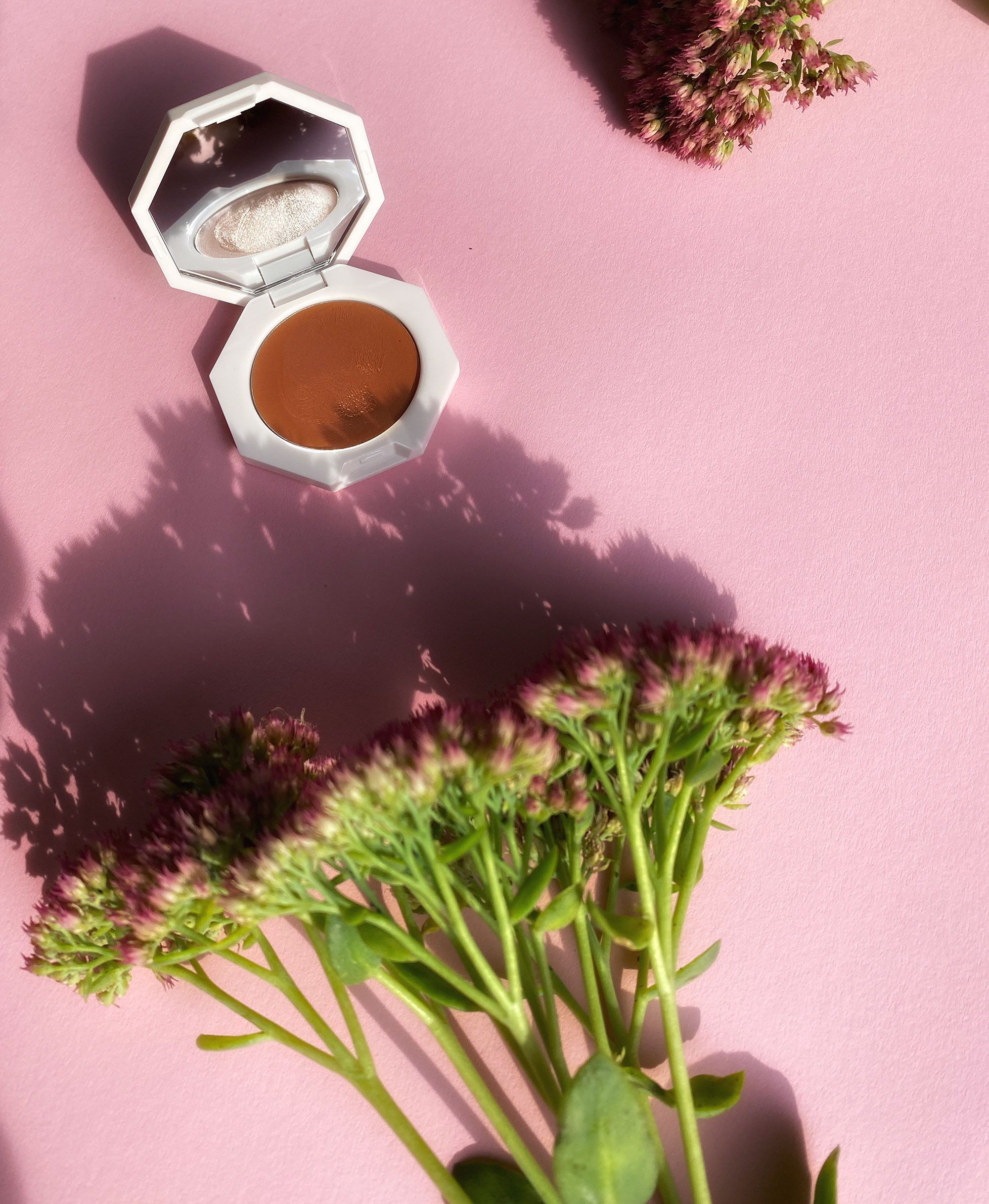 Nachdem der Bronzer matt ist, kommt nun wieder Glanz ins Spiel. Und zwar mit einem cremigen Blush, das sich ganz einfach mit den Fingern auf die Wangen auftragen lässt. Ich greife gerne zu warmen, erdigen Tönen, um den sonngeküssten Look komplett zu machen. Wenn mir nach mehr Farbe ist, würde ich einen Pfirsichton wählen. Ich habe mich für den Cheeks Out Freestyle Cream Blush von Fenty Beauty in der Nuance Rosé Latte entschieden und gebe in Apfelbäckchenform etwas auf meine Wangen und anschließend auch einen Klacks auf meine Augenlider. Im Döschen sehen alle Farben des Cheeks Out Blushes sehr intensiv aus, auf der Haut aufgetragen, sind sie jedoch zart und lassen sich mit mehr Produkt leicht aufbauen beziehungsweise intensivieren.