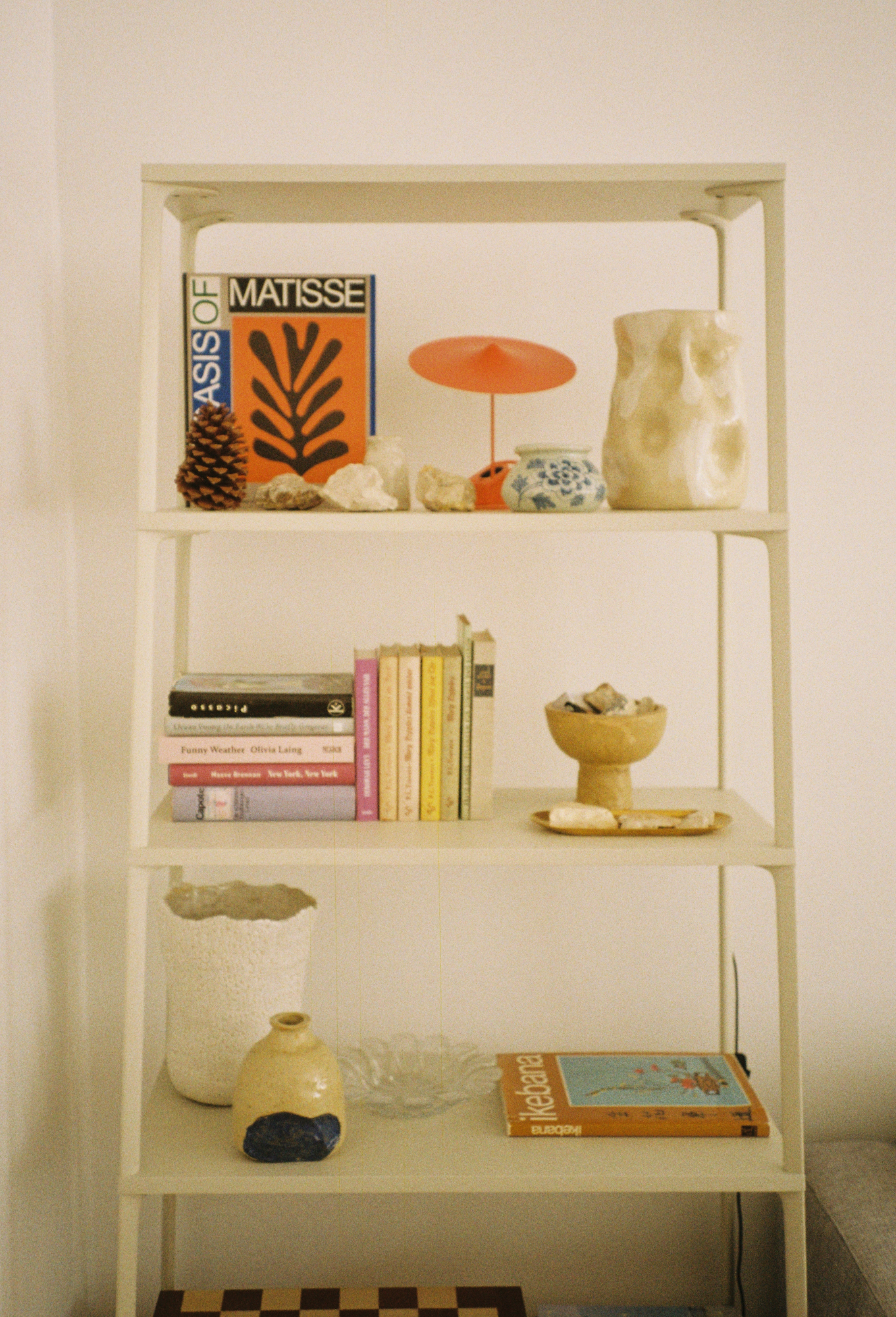 Das hellgraue HAY Eiffel Regal habe ich mir nach einigem Sparen für meine erste eigene Wohnung gekauft, wo es seither als Schauplatz für Dinge, die mir Freude bereiten, dient: gesammelte Mitbringsel und Souvenirs von bisherigen Reisen, schöne Bücherfunde, selbst getöpferte Keramik und Geschenke von Freund*innen und Familie.
