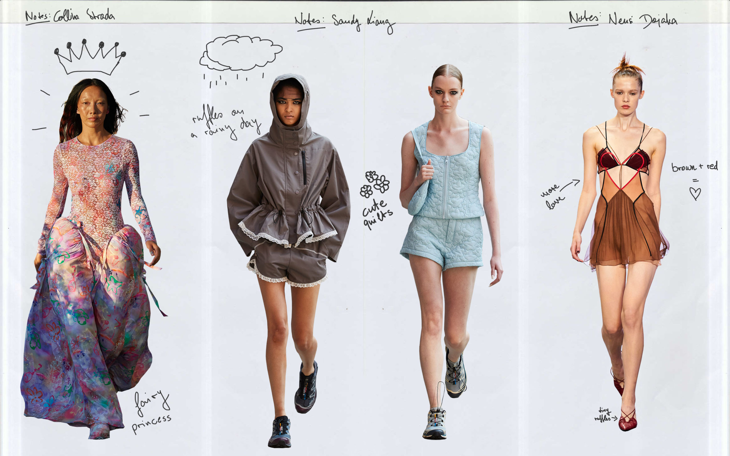 Nicht minder verträumt, jedoch weniger bunt ging es bei Sandy Liang zu. Während Regentage mit Rüschen und Spitzenporte überstanden werden, gibt es für sommerlichere Tage ein hellblaues Stepp-Ensemble samt Wolken-Prägung.