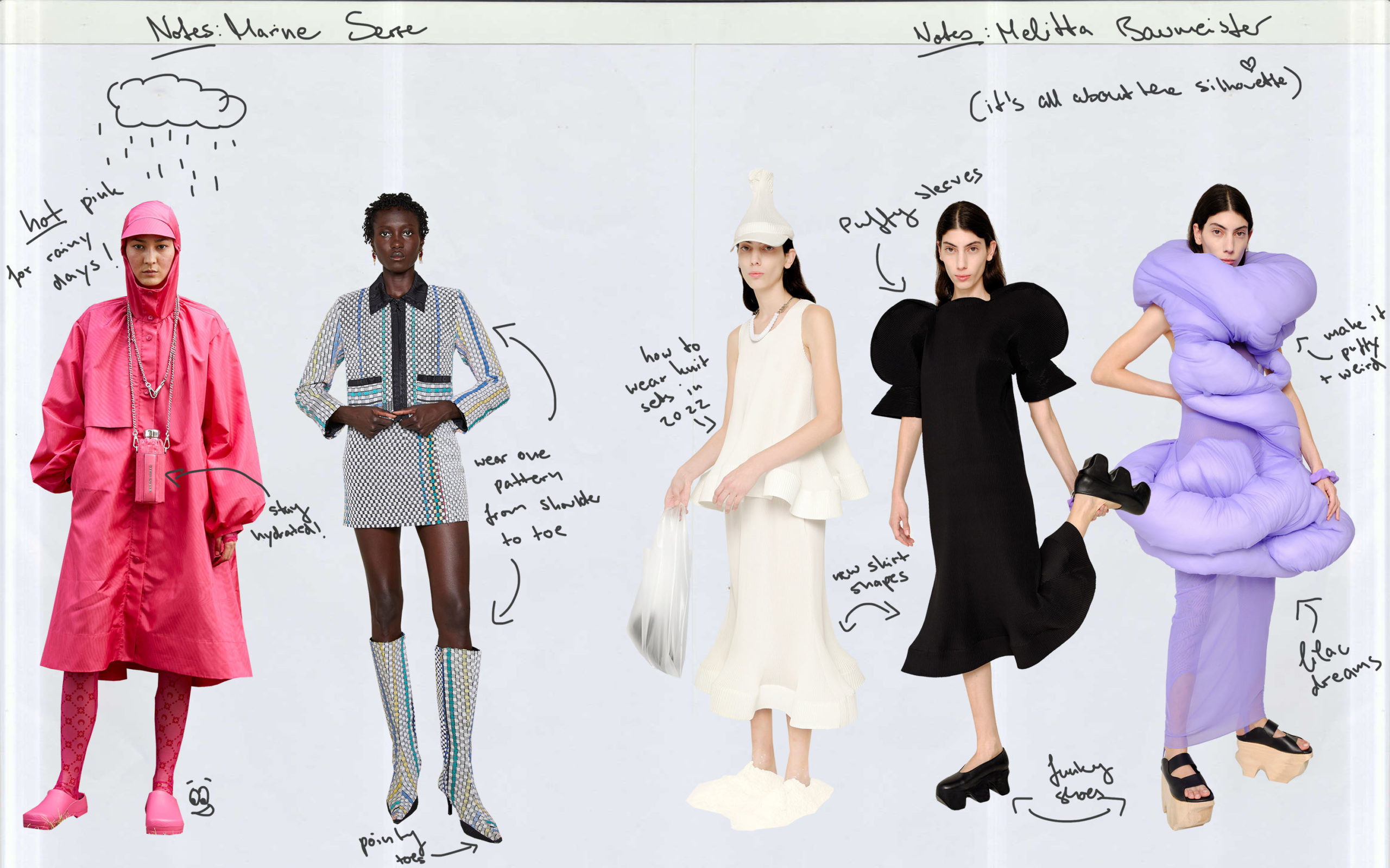 Großartige avantgardistische Entwürfe zeigt die deutsche Designerin Melitta Baumeister schon länger, die Looks der SS22-Saison begeisterten mich aber noch einmal mehr. Im Fokus standen, wie so oft, starke Silhouetten, die in Teilen an Rei Kawakubos „Lumps and Bumps“ Kollektion erinnerten. Farblich bewegten sich die Kreationen zwischen sanftem Weiß, tiefem Schwarz und verspieltem Lila — streng getrennt in unifarbenem Styling. Neben der Kleidung selbst zeigten sich auch die Schuhe als Highlights: Plattform-Sohlen mit starken Auskerbungen verleihen selbst dem zurückhaltendsten Look eine Besonderheit.