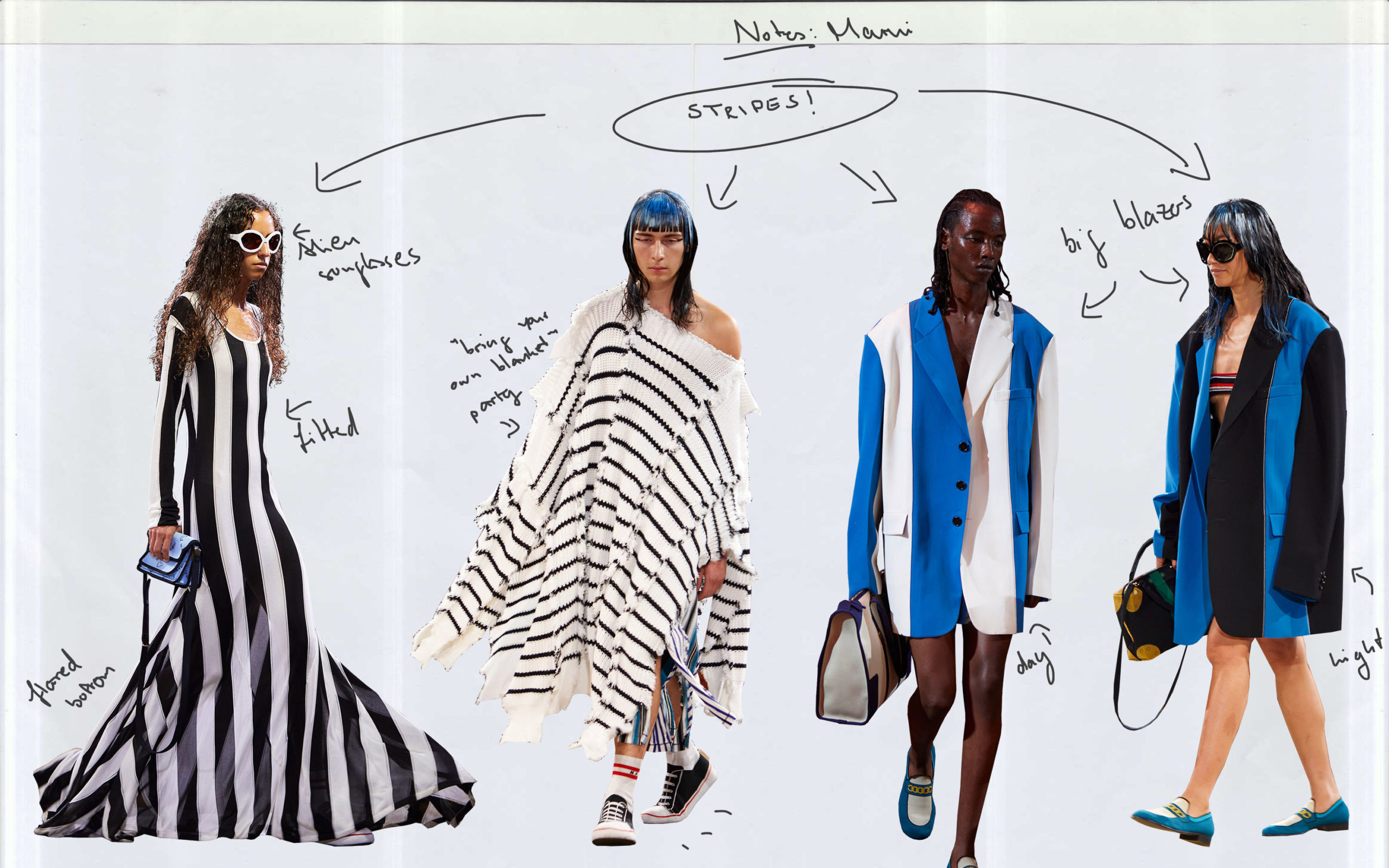 Für etwa 400 Personen veranstaltete Marni in dieser Saison Fittings. Während die Models in die neue SS22-Kollektion gehüllt wurden, wurden Gäste und Performer der Show (wie etwa der Poet Mykki Blanco) in handbemalte Upcycling-Looks gekleidet — Streifen dominierten also nicht nur den Laufsteg, sondern auch die Sitz- und Stehplätze. Die Kollektion selbst überzeugte mich unmittelbar mit weit geschnittenen Blazern, riesigen Pullover-Kleidern, die Decken nahekamen sowie einem gestreiften Maxikleid. Alle Kleidungsstücke umgab ein wundervoller Hauch „Weirdness“, der die Kreationen von Francesco Risso umso besser machte.