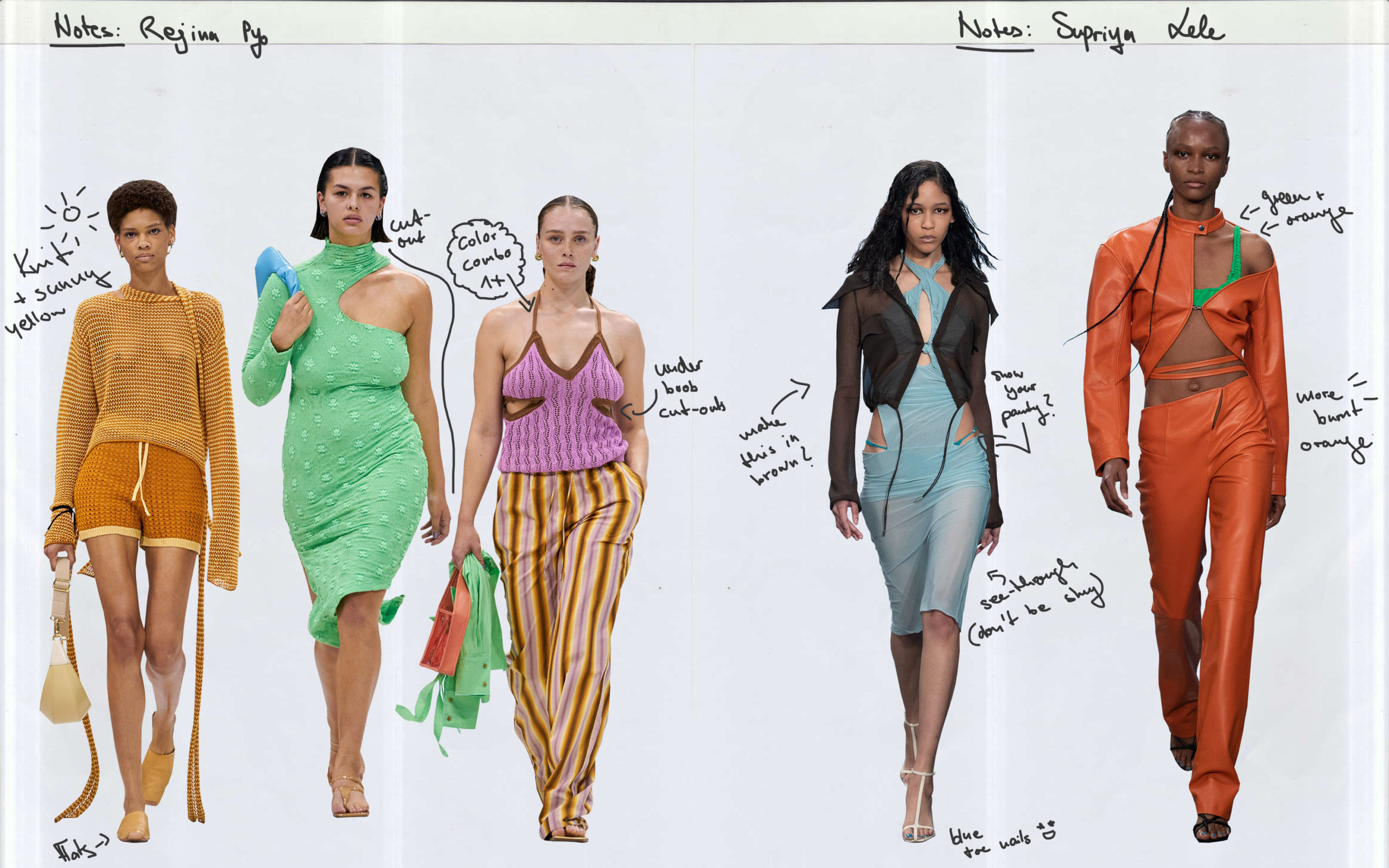 Bei Supriya Lele präsentierte man derweil einen Zweiteiler in „Burnt Orange“, der wie auch bei Eckhaus Latta aus Leder gefertigt wurde. Für einen farblichen Kontrast sorgte ein grünes Bralet. Außerdem zu sehen: Der Bund des Höschens, der durch raffinierte Cut-Outs auf Hüfthöhe freigelegt wurde und — mit ein wenig Fantasie — Erinnerungen an Tom Fords Gucci aufleben ließ.