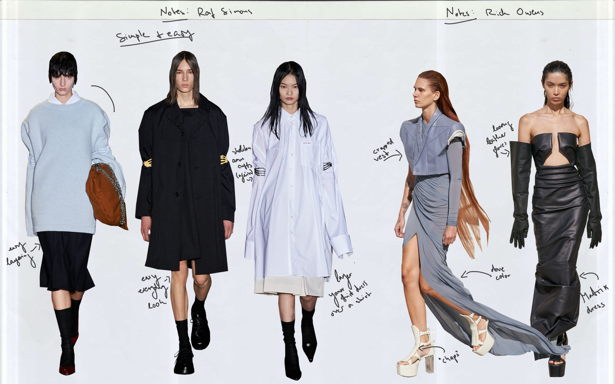 Auf wohl kaum eine andere Show freue ich mich halbjährlich so sehr wie auf Raf Simons. Genderfreie Mode kreiert der Designer bereits seit längerer Zeit, doch vielleicht war es noch nie so eindrücklich wie in seiner SS22-Kollektion: Weit geschnittene, lange Hemden wurden über knielange Röcke getragen, dazu Skelett-Armcuffs, die bereits in der vergangenen Saison zu sehen waren, sowie hochgezogene Strümpfe und Schnürschuhe. Die Looks rückten eine neue Art der Uniform oder gar Businesswear, die für jedes Geschlecht funktioniert, in den Fokus. Was mich jedoch immer wieder fasziniert, ist die Tragbarkeit. Der Großteil der Looks lässt sich mit einigen wenigen Handgriffen nachstylen.
