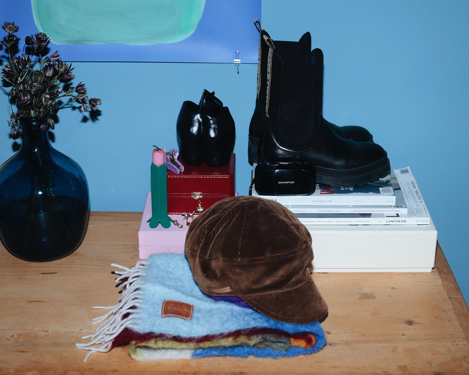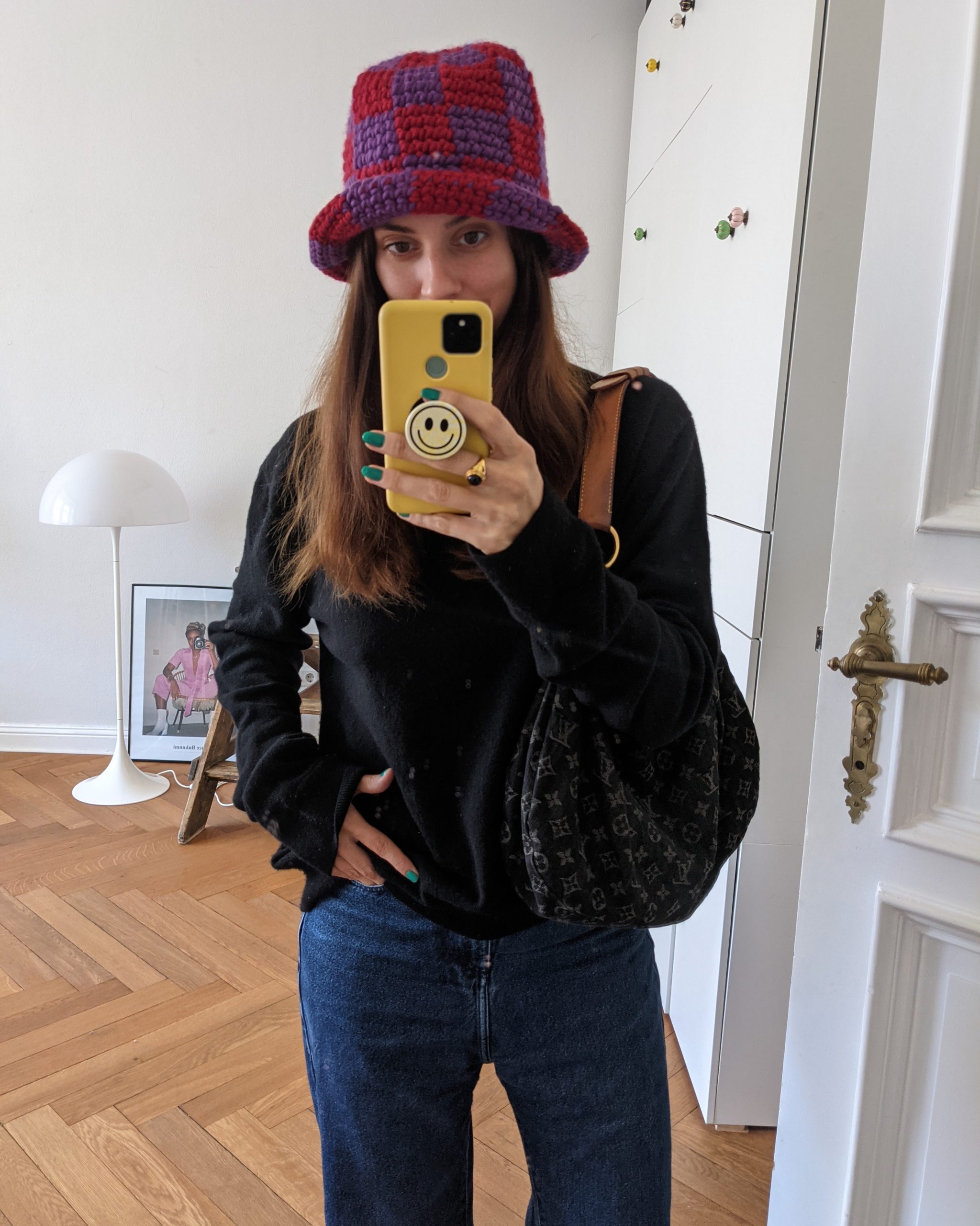Denke ich an den Herbst, kommen mir zu allererst meine braunen Dr. Martens Boots in den Sinn, die mich nun schon seit elf Jahren begleiten, und ich meine wirklich, dass es kaum eine bessere Alternative für Regen, Schnee und Schlamm gibt. Ohne einen ordentlichen, locker fallenden Rollkragenpullover aus Cashmere in Gedenken an existenzialistische Studienjahre würde mir wohl auch etwas fehlen, der Hut von Pauluschkaa bringt etwas Schwung in graue Spaziergänge, meine 2nd Hand Denim Bag von Louis Vuitton war die vielleicht beste Taschen-Anschaffung meines Erwachsenenlebens und das Grün auf meinen Nägeln stimmt mich beim täglichen Tippen glücklich. Außerdem packe ich all meine Schlafanzüge oder kuscheligen Zweiteiler aus. Zuhause trage ich am liebsten Pyjamas oder Hausanzüge, für die Gemütlichkeit, ganz gleich, ob ich am Schreibtisch sitze oder mit L. zusammen auf dem Boden liegend die wildesten Hot Wheels Strecken errichte.