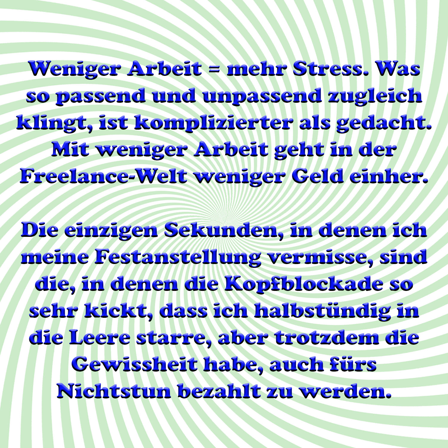 Denn bei mir resultiert eines daraus: Weniger Arbeit = mehr Stress. Was so passend und unpassend zugleich klingt, ist komplizierter als gedacht. Mit weniger Arbeit geht in der Freelance-Welt weniger Geld einher. Die einzigen Sekunden, in denen ich meine Festanstellung vermisse, sind die, in denen die Kopfblockade so sehr kickt, dass ich halbstündig in die Leere starre, aber trotzdem die Gewissheit habe, auch fürs Nichtstun bezahlt zu werden. Ist im Arbeitsvertrag ja oftmals einkalkuliert. Ereignen sich solche Tage in der Freelance-Welt oder kündigt sich in der zweiten Woche infolge