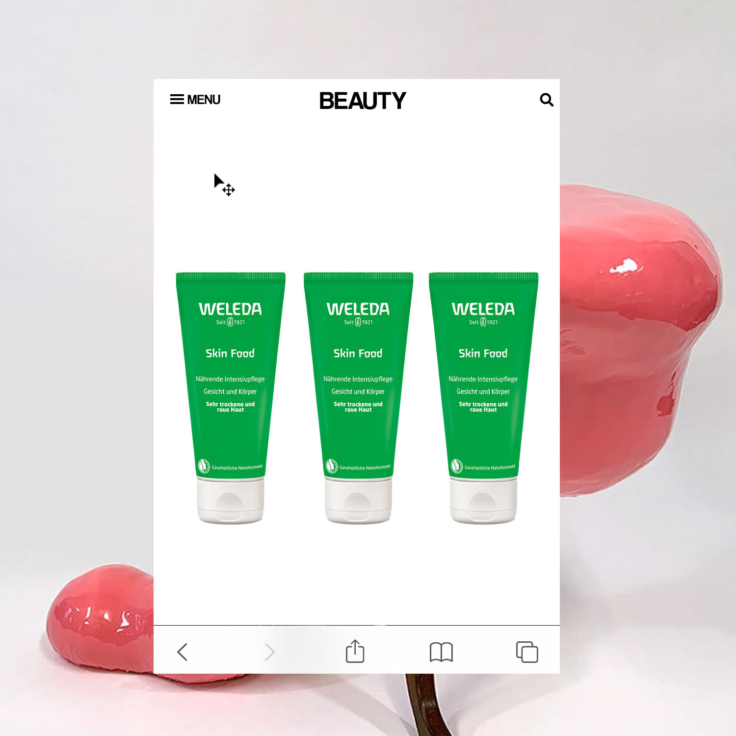 Eine Basispflege, die für mich immer funktioniert. Wenn ich viel unterwegs bin, nehme ich gerne Produkte mit, die multifunktional und unkompliziert sind. Die Weleda Skin Food Creme ist für mich genau das. Unkompliziert für die Haut und sowohl im Gesicht, an trockenen Stellen am Körper und auch als Nagelpflege einsetzbar. Extrakte aus Kamillen-, Stiefmütterchen- und Calendulablüten beruhigen die Haut. Noch dazu spendet die Creme Feuchtigkeit und stärkt die Hautbarriere. Sie braucht einen Moment, um einzuziehen, funktioniert aber auch einwandfrei als Make-up-Grundlage.