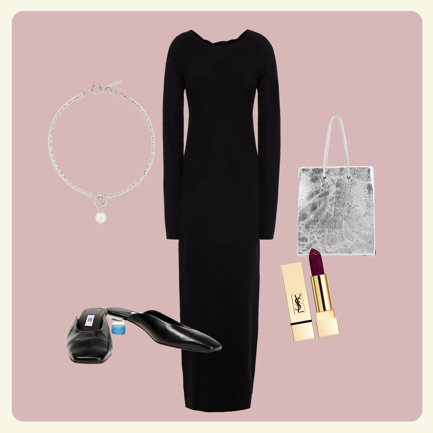 Während das schwarze Maxikleid im Alltag vermeintlich simpel kombiniert werden kann, sorgen besondere Accessoires und ein auffallender Lippenstift für die nötige Portion Extravaganz. In diesem Fall zu sehen: eine silberfarbene Mini Bag, eine glitzernde Kette, Schuhe mit Flaschen-Absatz und ein dunkler, lilafarbener Lippenstift.