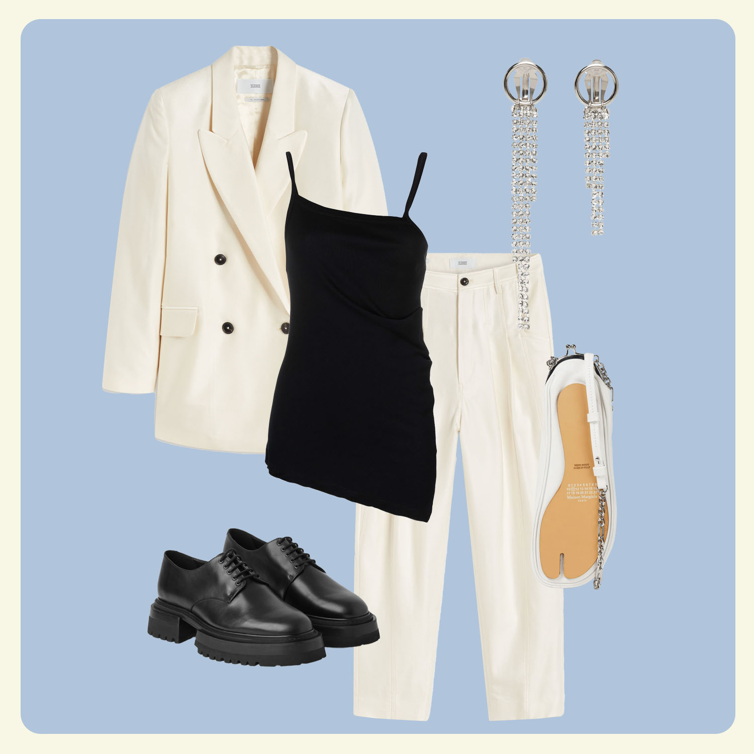 Ein weißer Anzug funktioniert, ebenso wie das asymmetrische Top, natürlich auch an weniger festlichen Tagen, durch glitzernde Ohrringe und eine extravagante Tasche (zum Beispiel à la Maison Margiela) kann man ihm jedoch ein wenig mehr Opulenz einhauchen.
