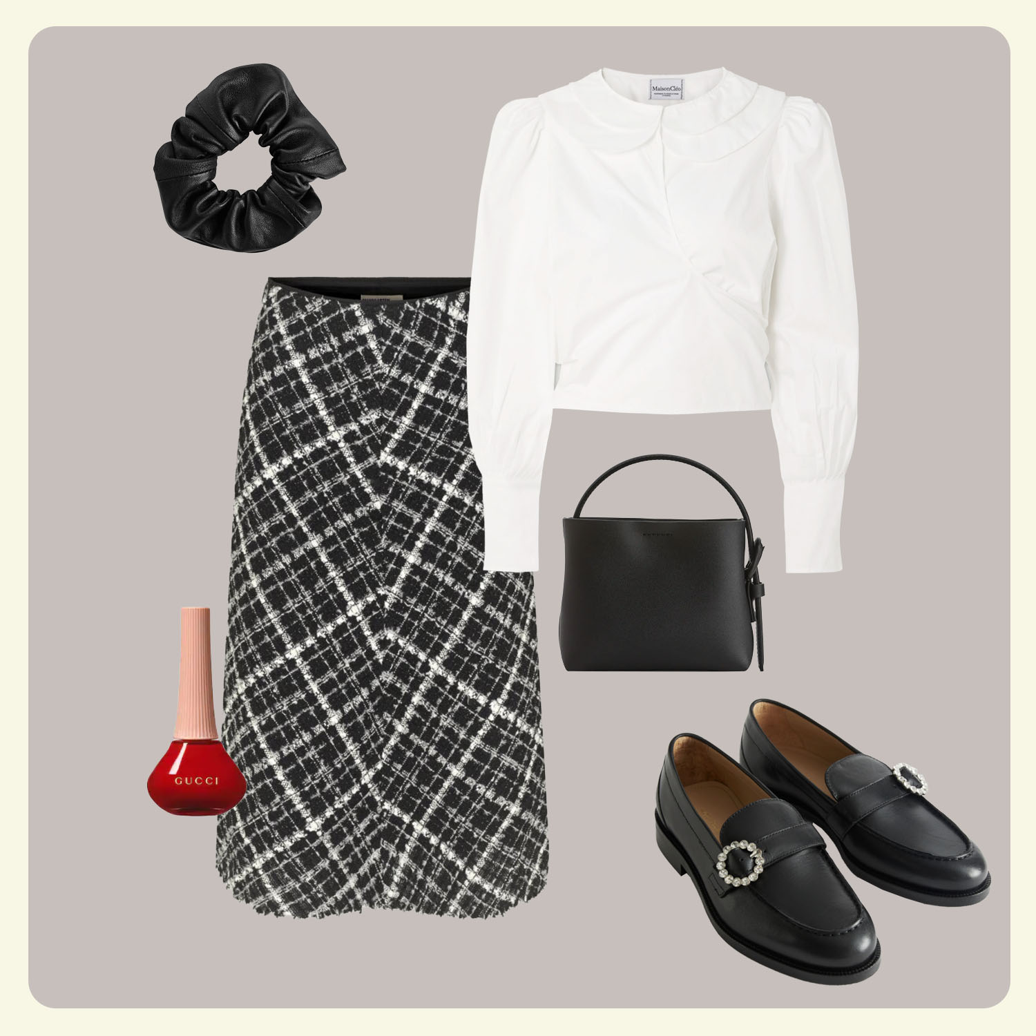 Midi-Kleid / Mary Janes / Haarschleife / Tasche / Rüschenstrümpfe / Lidschatten