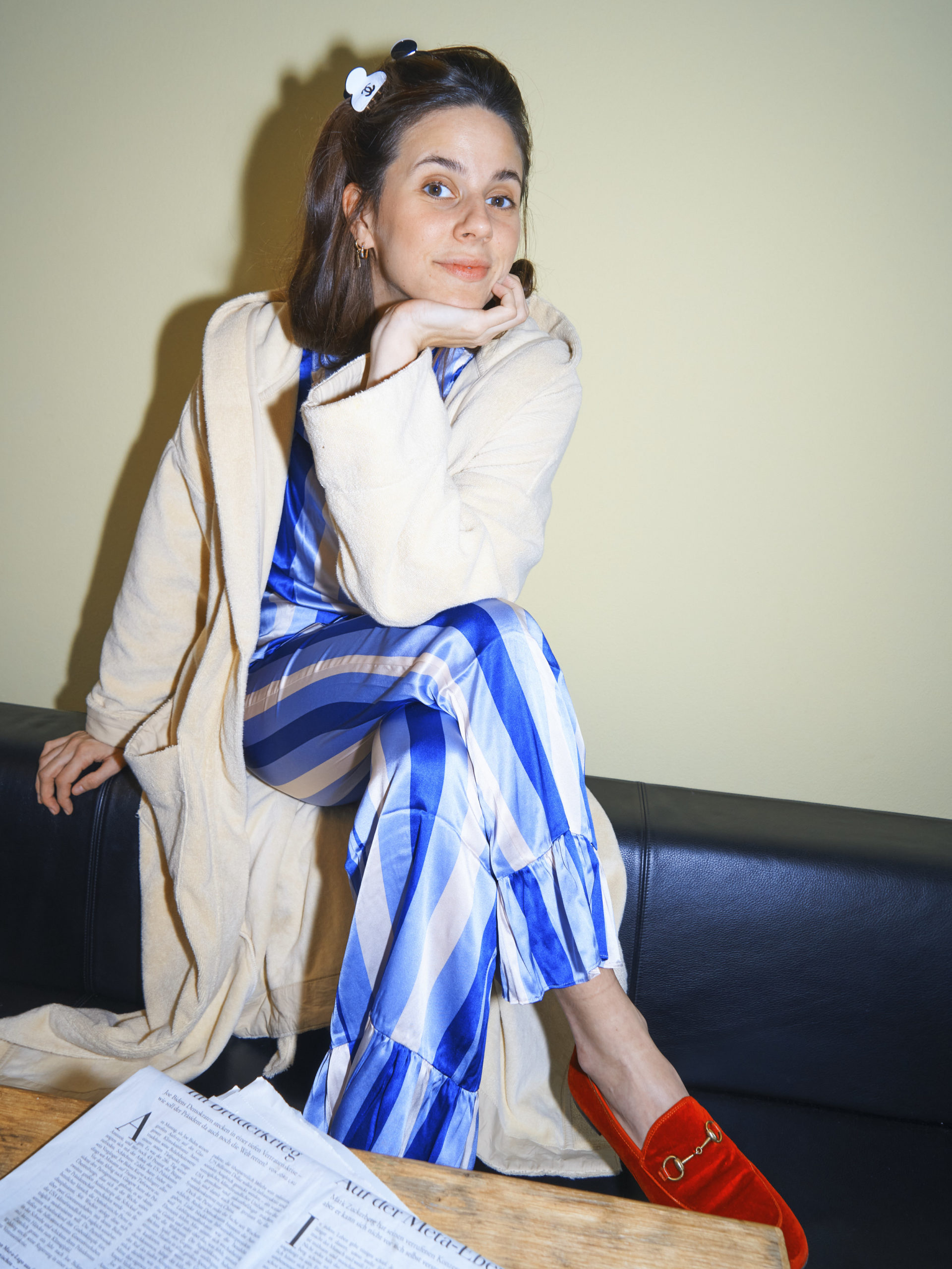 Bademantel: Aiayu, (Pyjama)Hose und Oberteil: Baum und Pferdgarten, Schuhe: Gucci, Haarspangen: Chanel