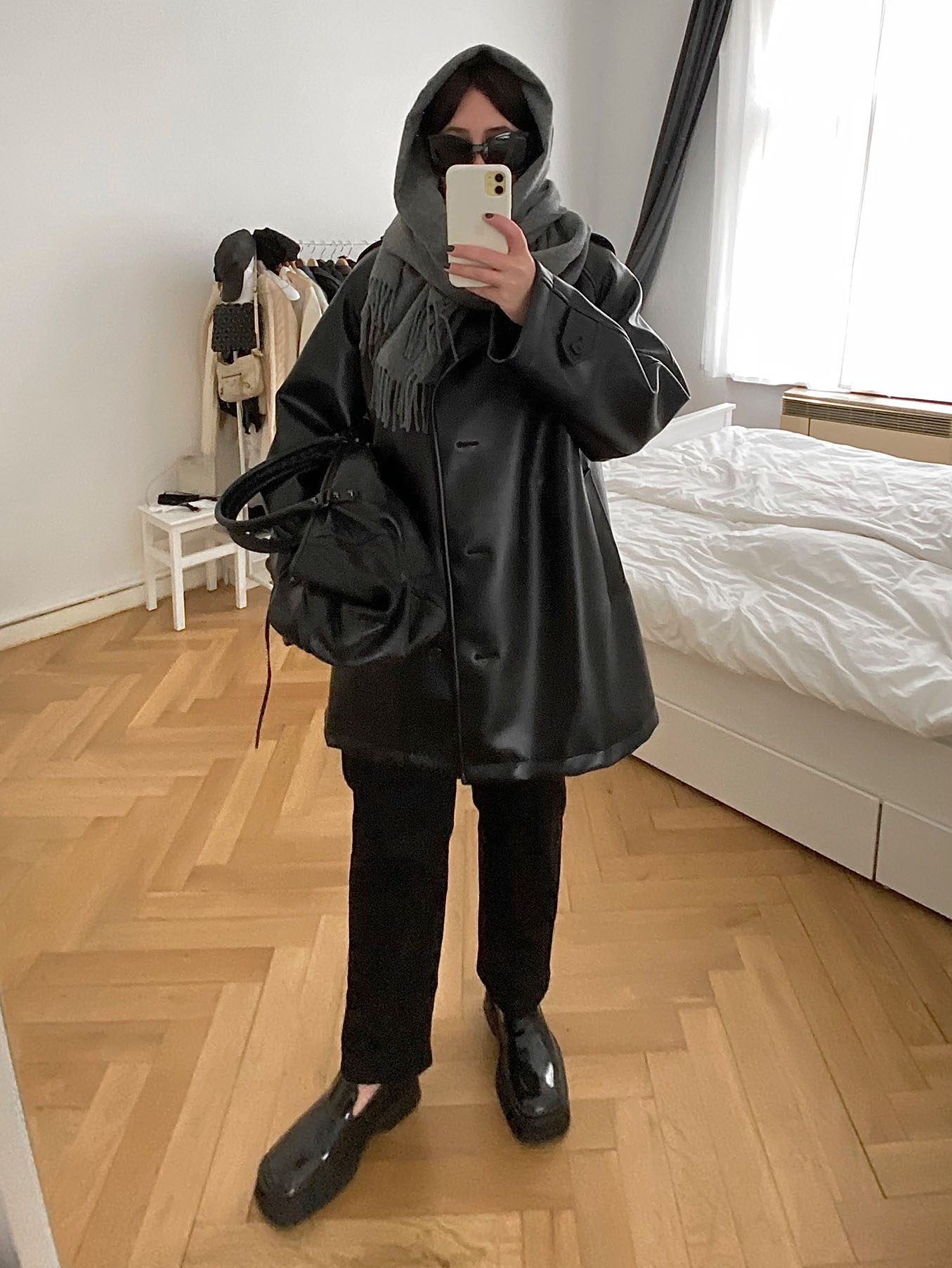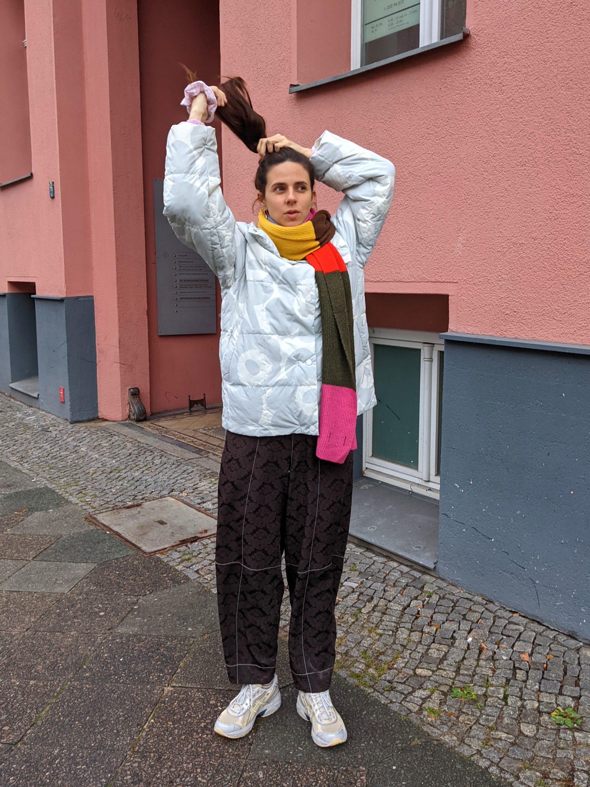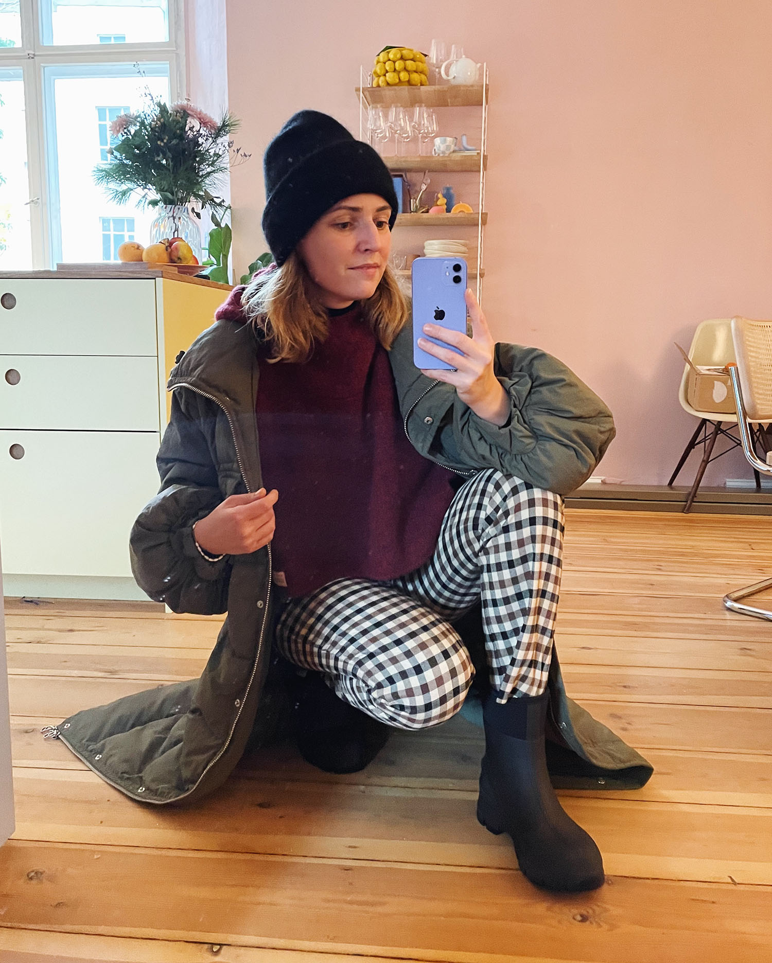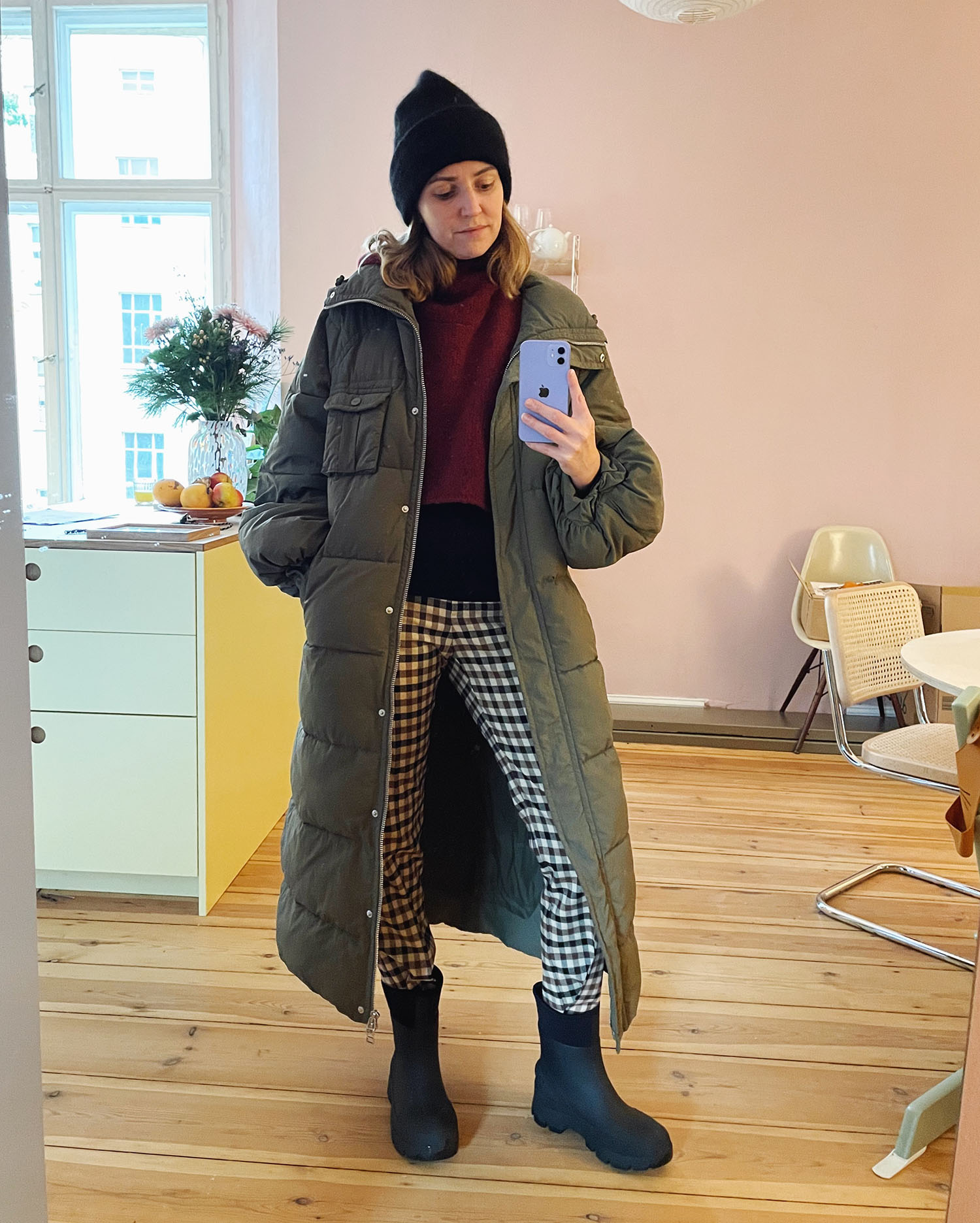 Wintermantel: Ganni (älter), Pullover: Arket, Balaclava: Closed, Hose: Edited, Boots: Arket x Tretorn