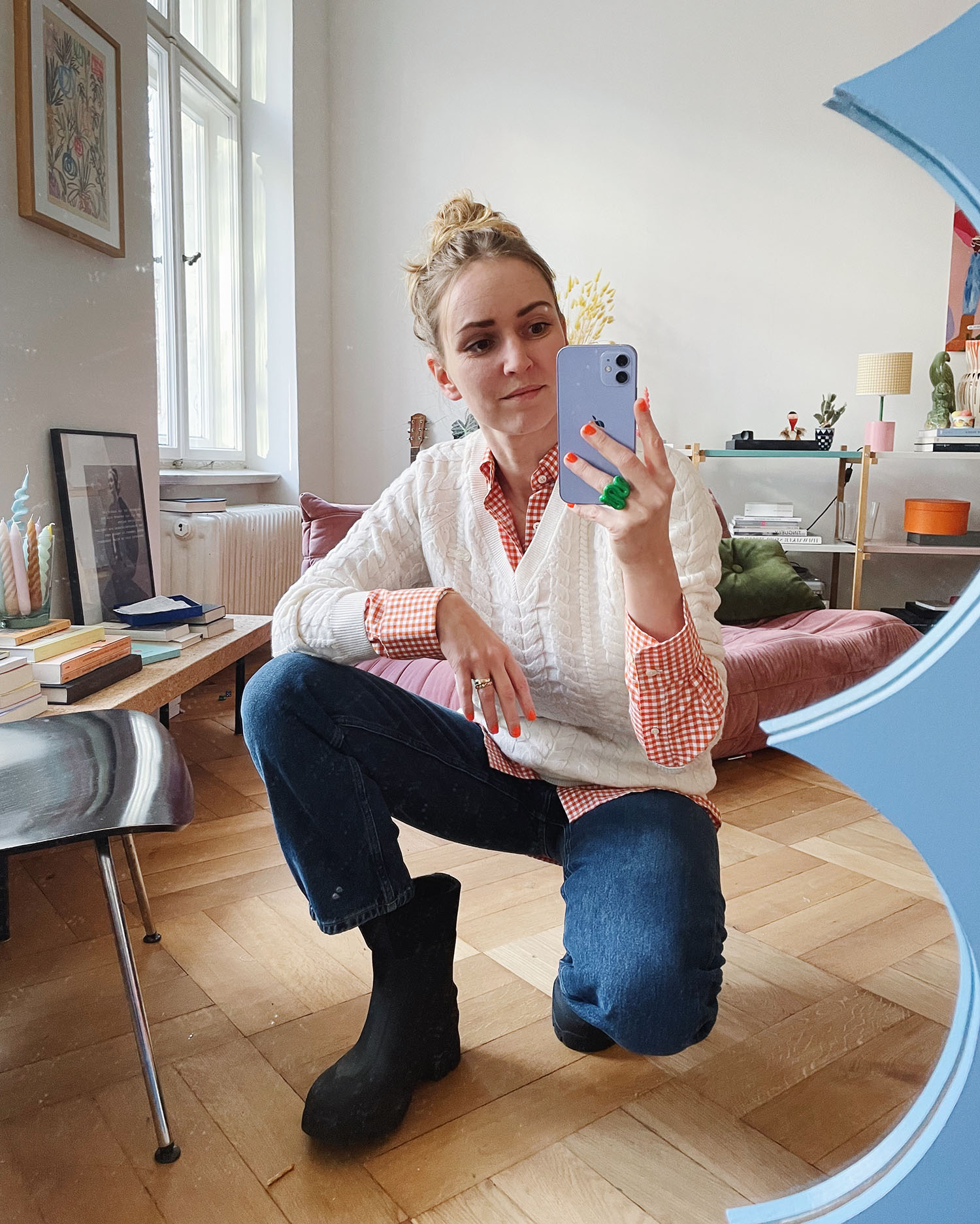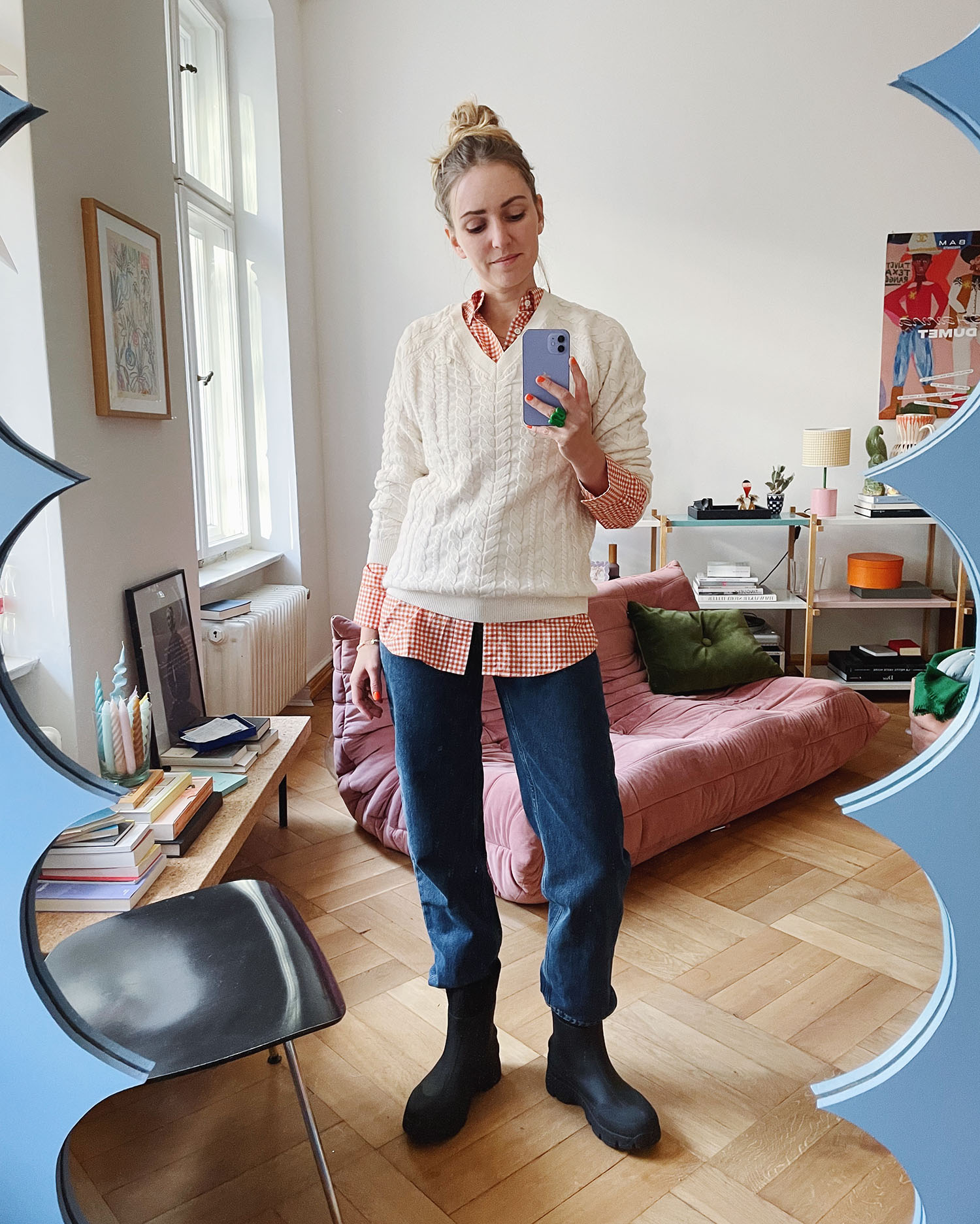 Hemd: Gant, Pullover: (ähnlicher) Lacoste, Jeans: Won Hundred, Stiefel: Arket x Tretorn