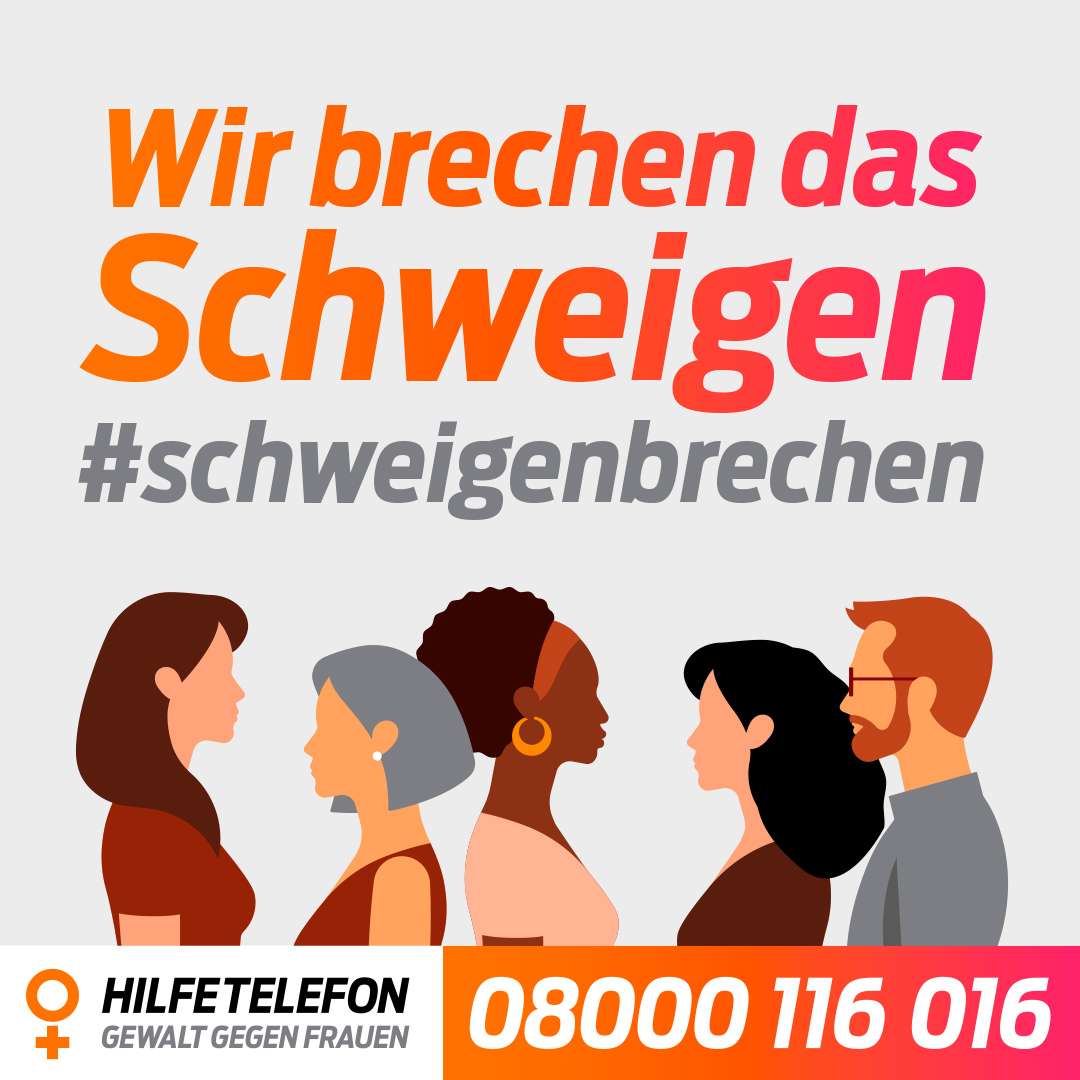 Anlässlich des Internationalen Tags gegen Gewalt an Frauen am 25. November startet das Hilfetelefon des Bundesamts für Familie und zivilgesellschaftliche Aufgaben die Mitmachaktion „Wir brechen das Schweigen“, um ein deutliches, solidarisches und bundesweit sichtbares Zeichen gegen Gewalt an Frauen zu setzen. Obwohl bundesweite Medien vor allem in den vergangenen Monaten der Pandemie verstärkt über Gewalttaten berichtete, wird Gewalt gegen Frauen noch immer häufig ignoriert und bagatellisiert. Wer bei der Aktion mitmachen möchte, kann ab heute ein Selfie mit dem Aktionsschild unter dem Hashtag #schweigenbrechen in den sozialen Netzwerken teilen. Alle eingereichten Beiträge werden in einer Fotogalerie geteilt.